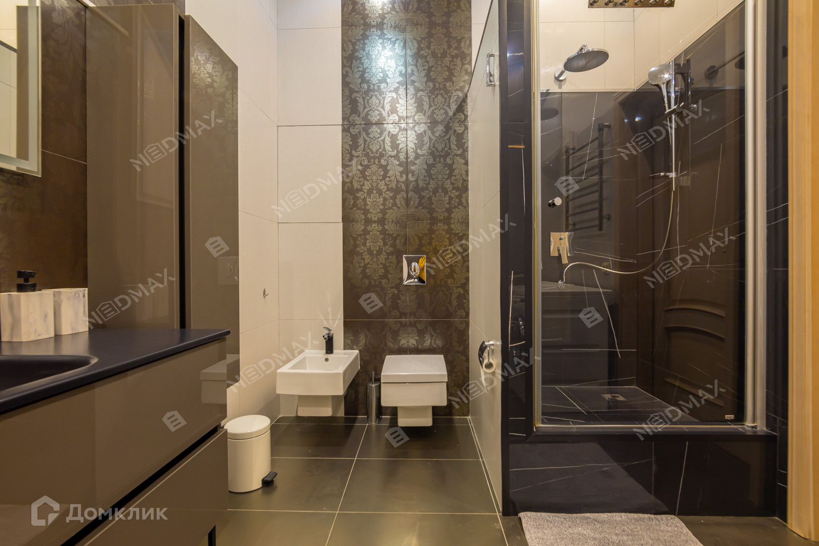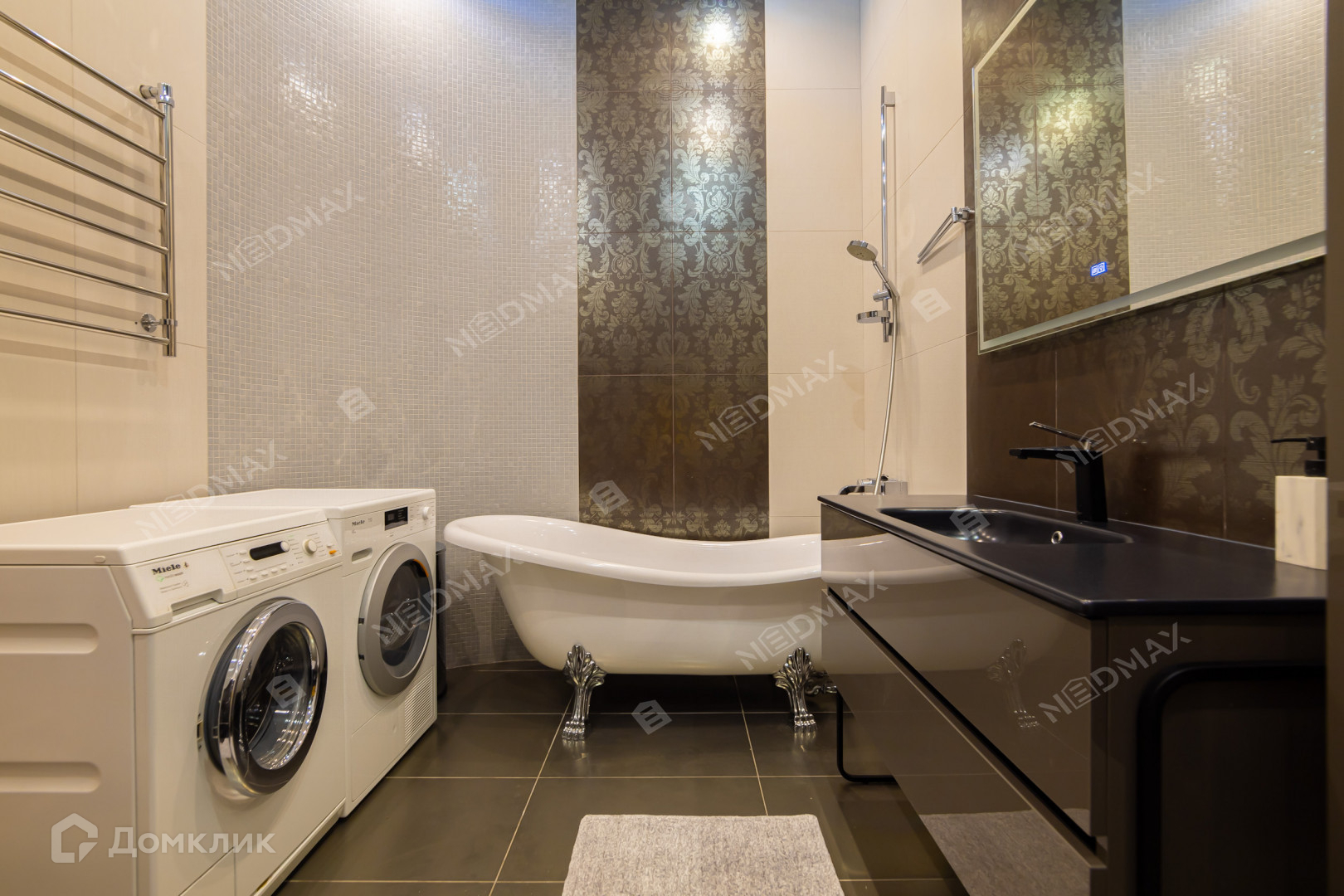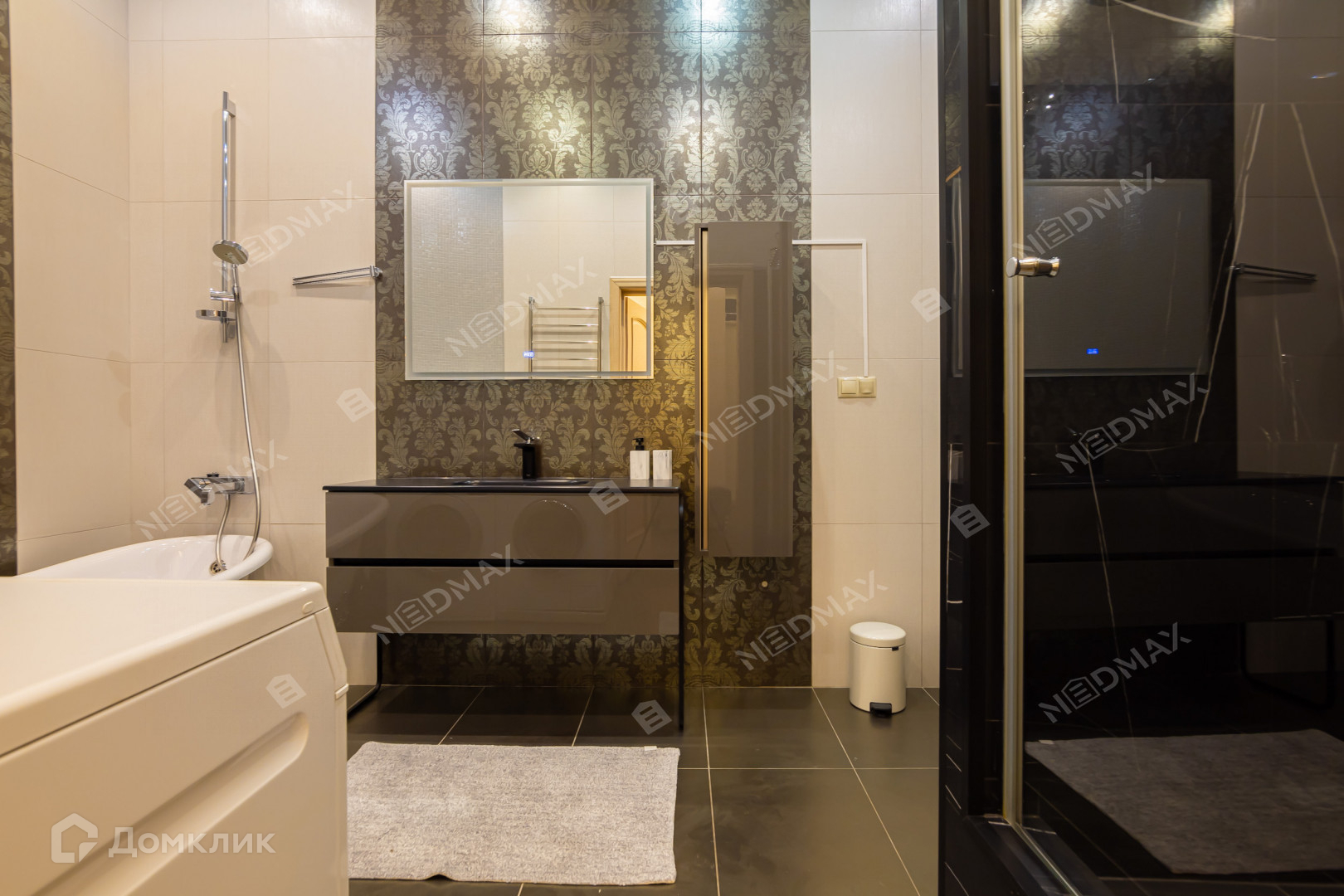 В санузле предусмотрены как ванна, так и душевая. Есть как стиральная, так и сушильная машины.