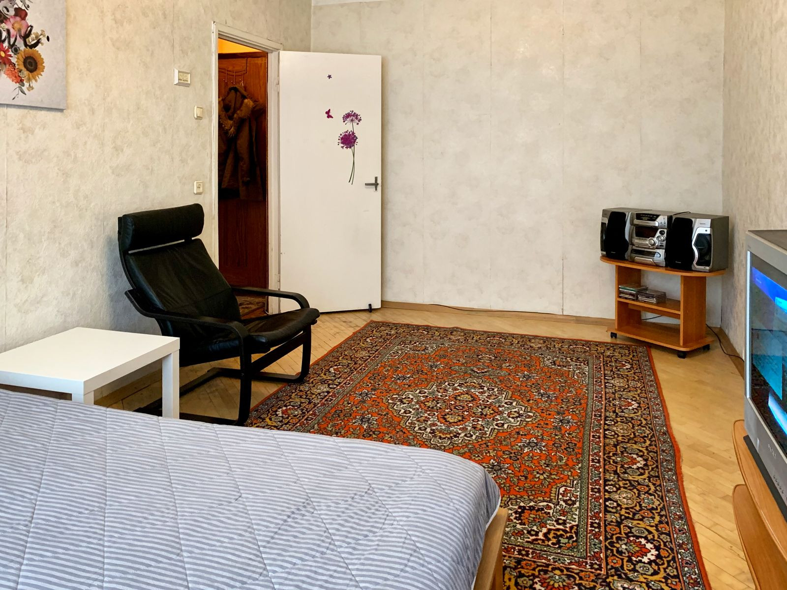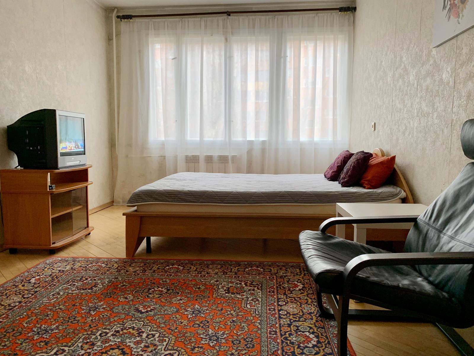 В комнате - новая 2-спальная кровать и кресло IKEA, тумба под ТВ.