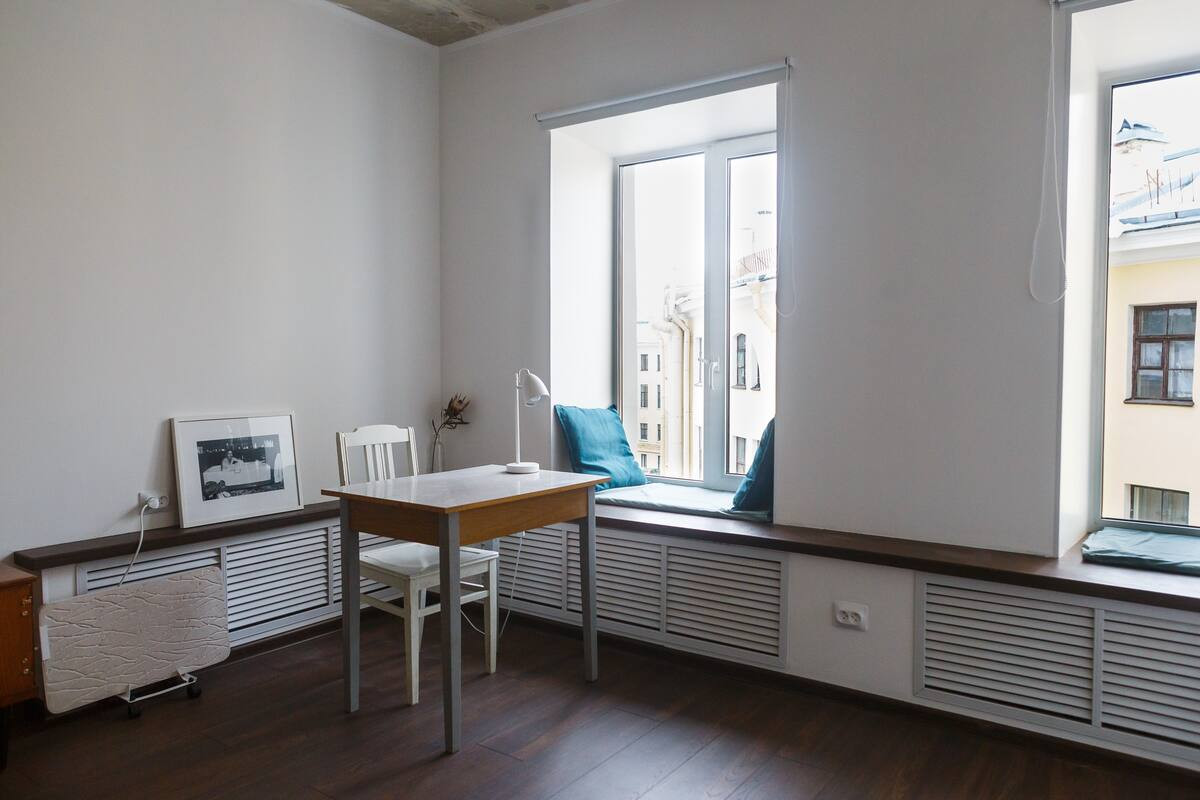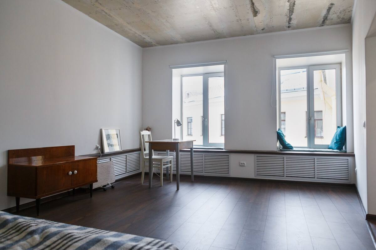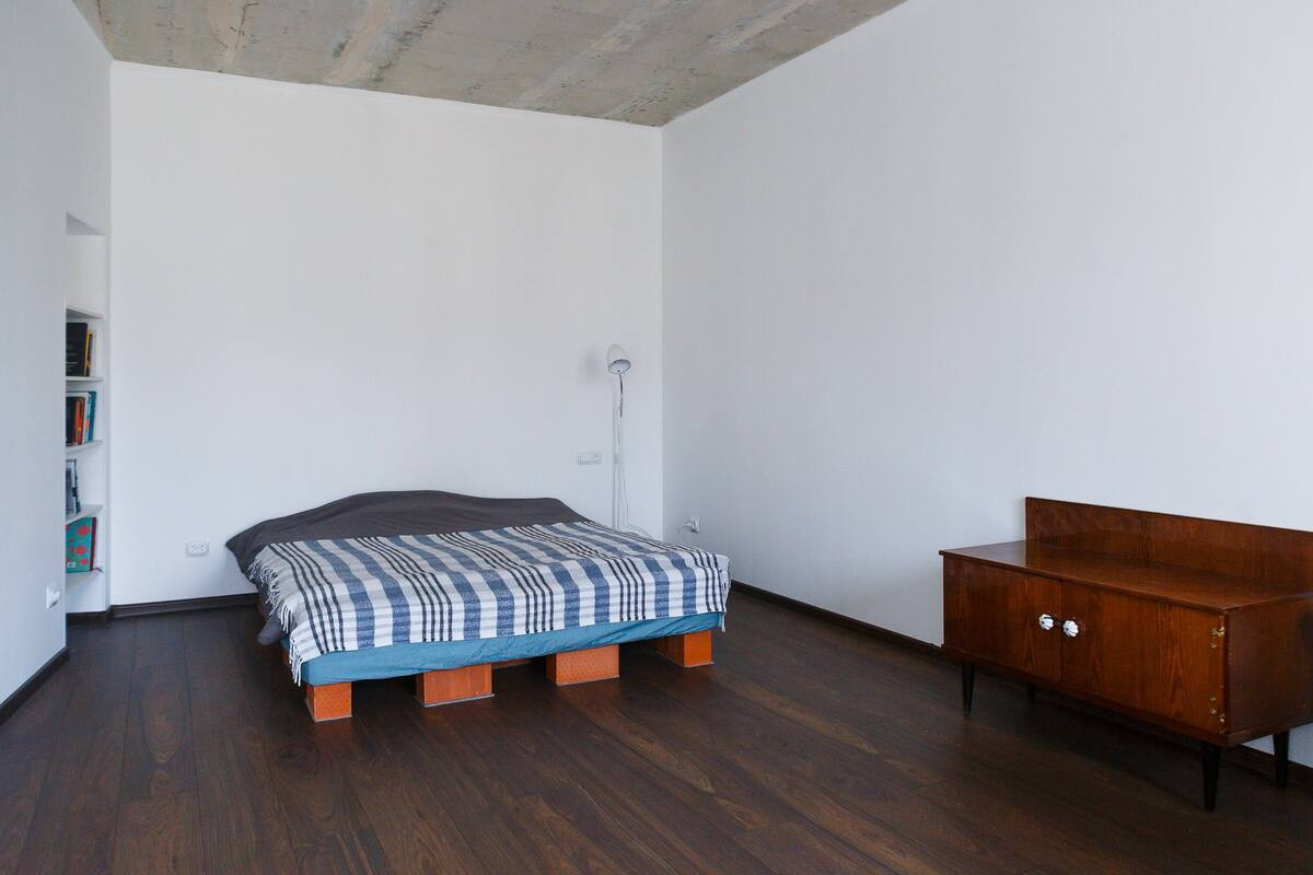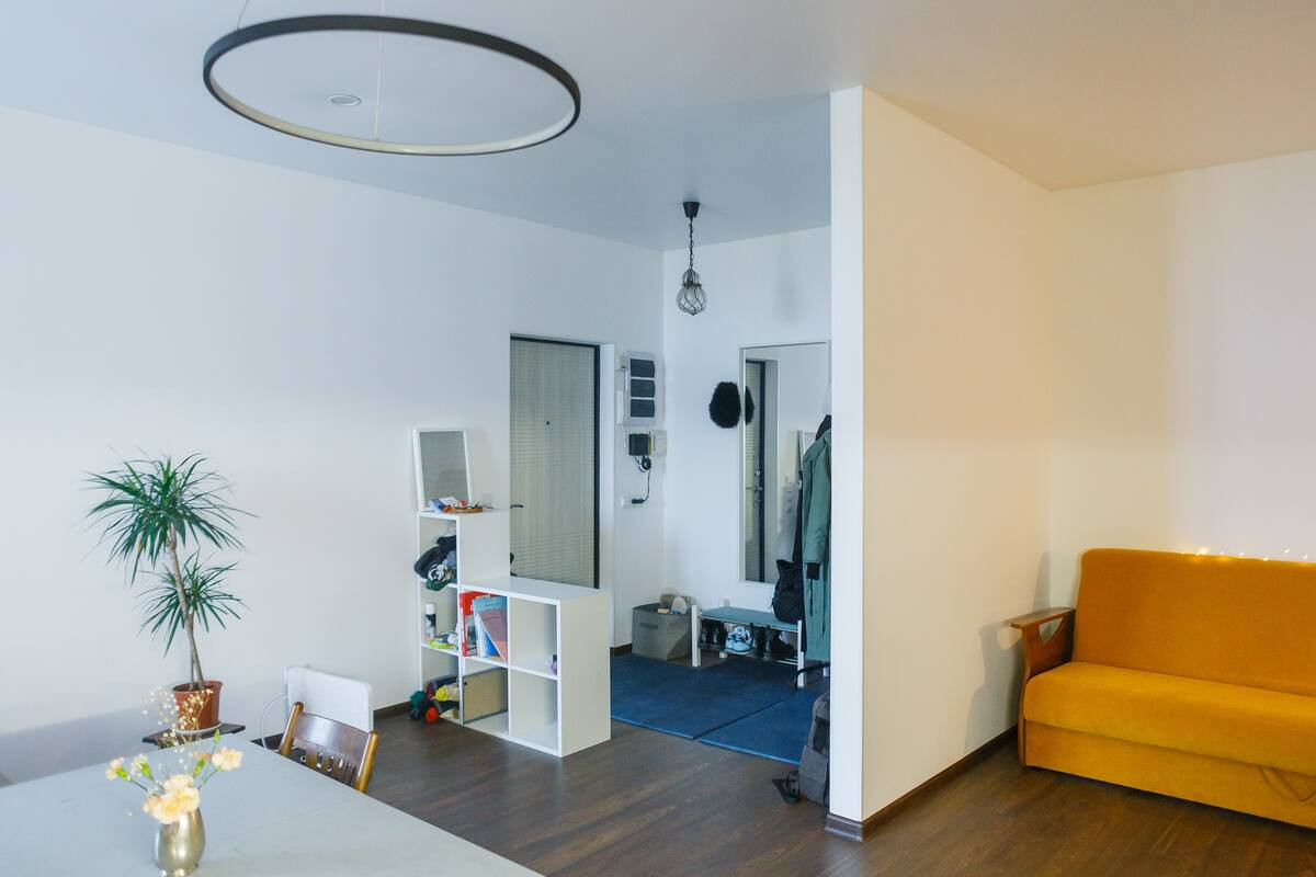 Мало мебели, белые стены, вид на дом-кольцо и небо. Комната, гостиная-кухня, гардеробная. 4 этаж без лифта, хорошие соседи, очень тихо. Посудомойка, стиралка, микроволновка и даже турник.
