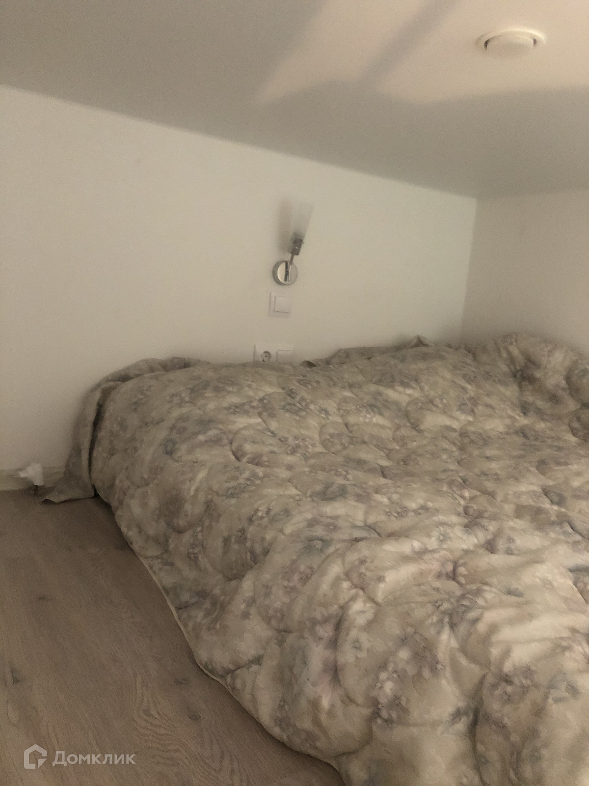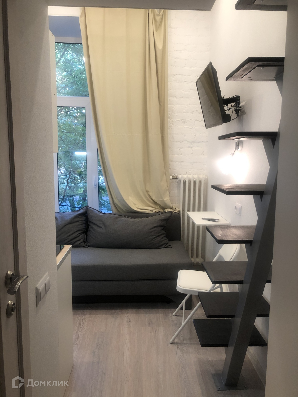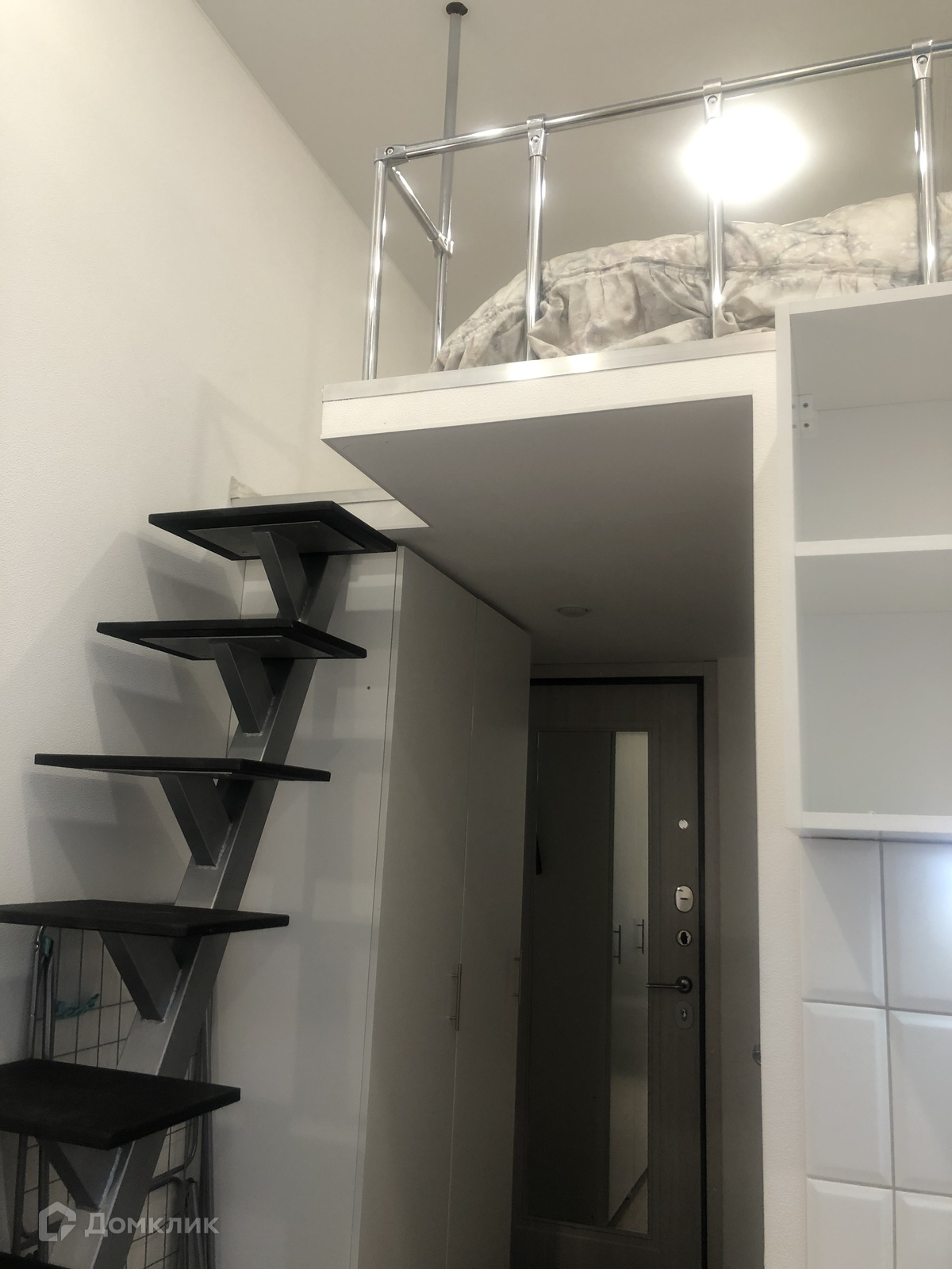 Студия имеет высоту потолка 3,5 метра, что позволило организовать широкое спальное место на втором ярусе помещения.