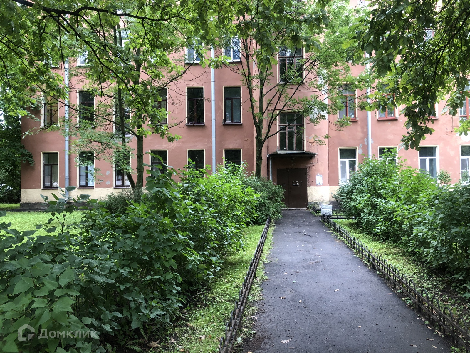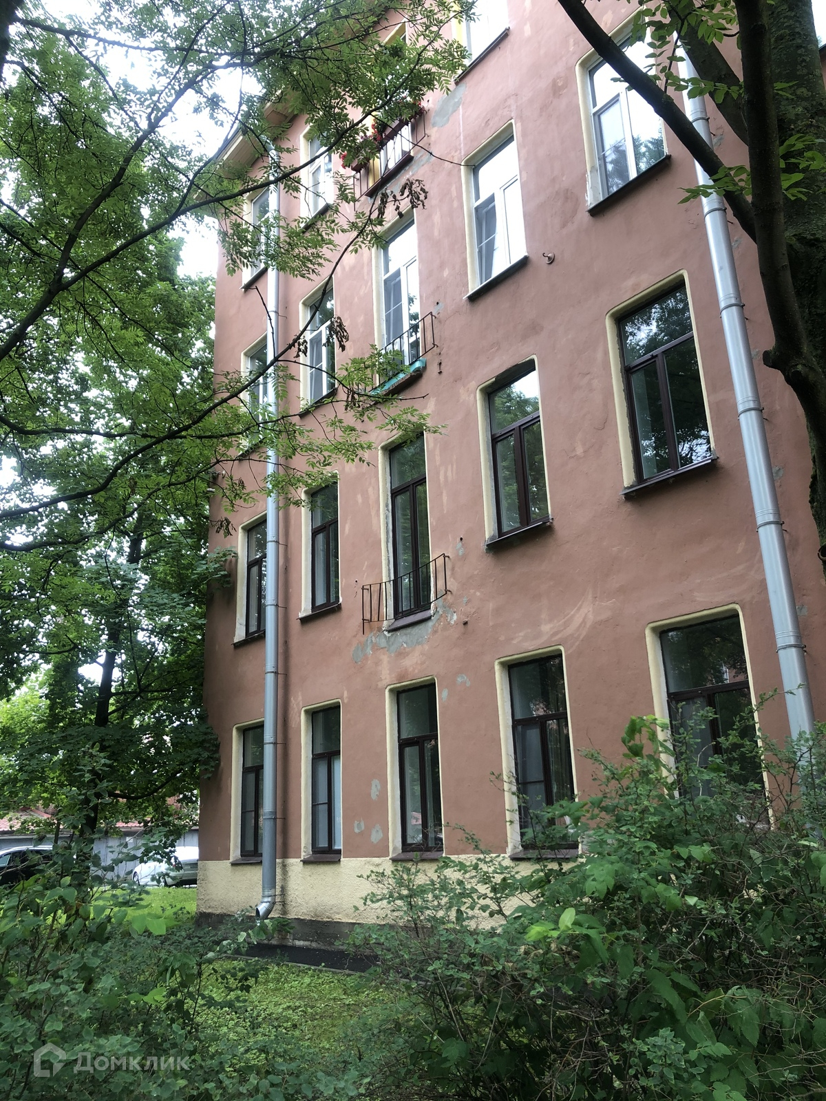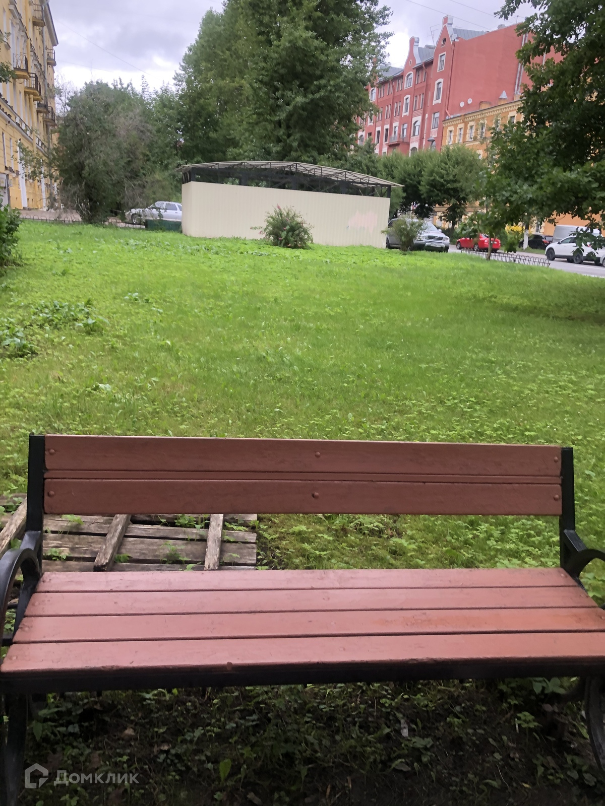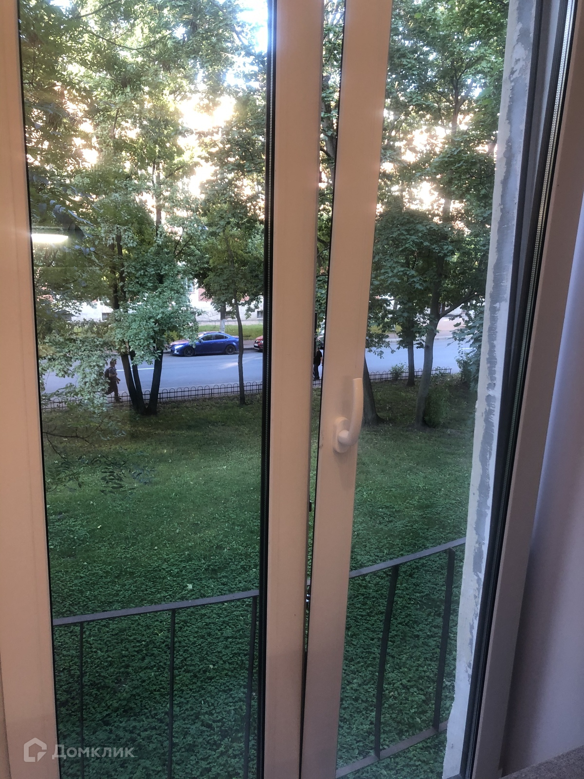 Окно в пол. Вид на улицу Красного Курсанта через широкий зелёный газон с деревьями.
