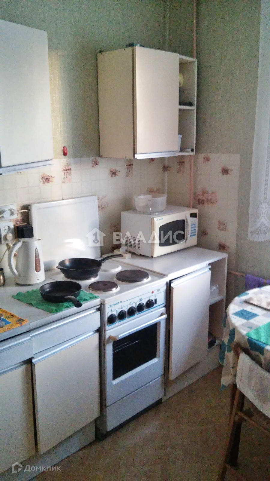 В квартире есть вся необходимая техника и мебель - стиральная машина, холодильник, микроволновка, электрическая плита, телевизор, кровать, диван, шкаф, обеденный и письменный стол.