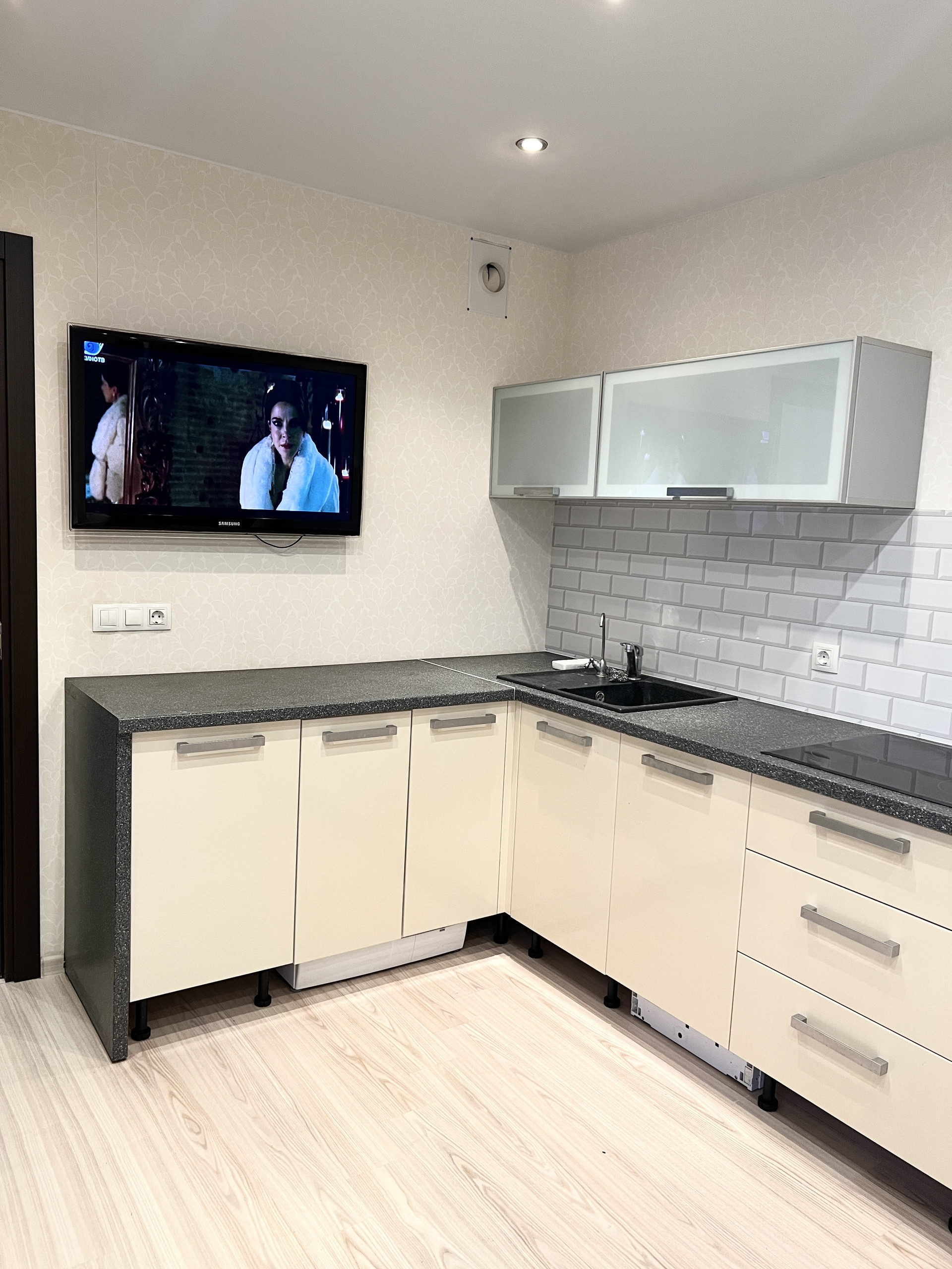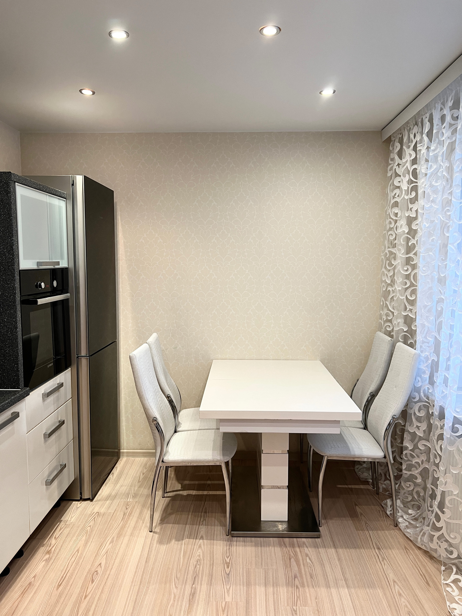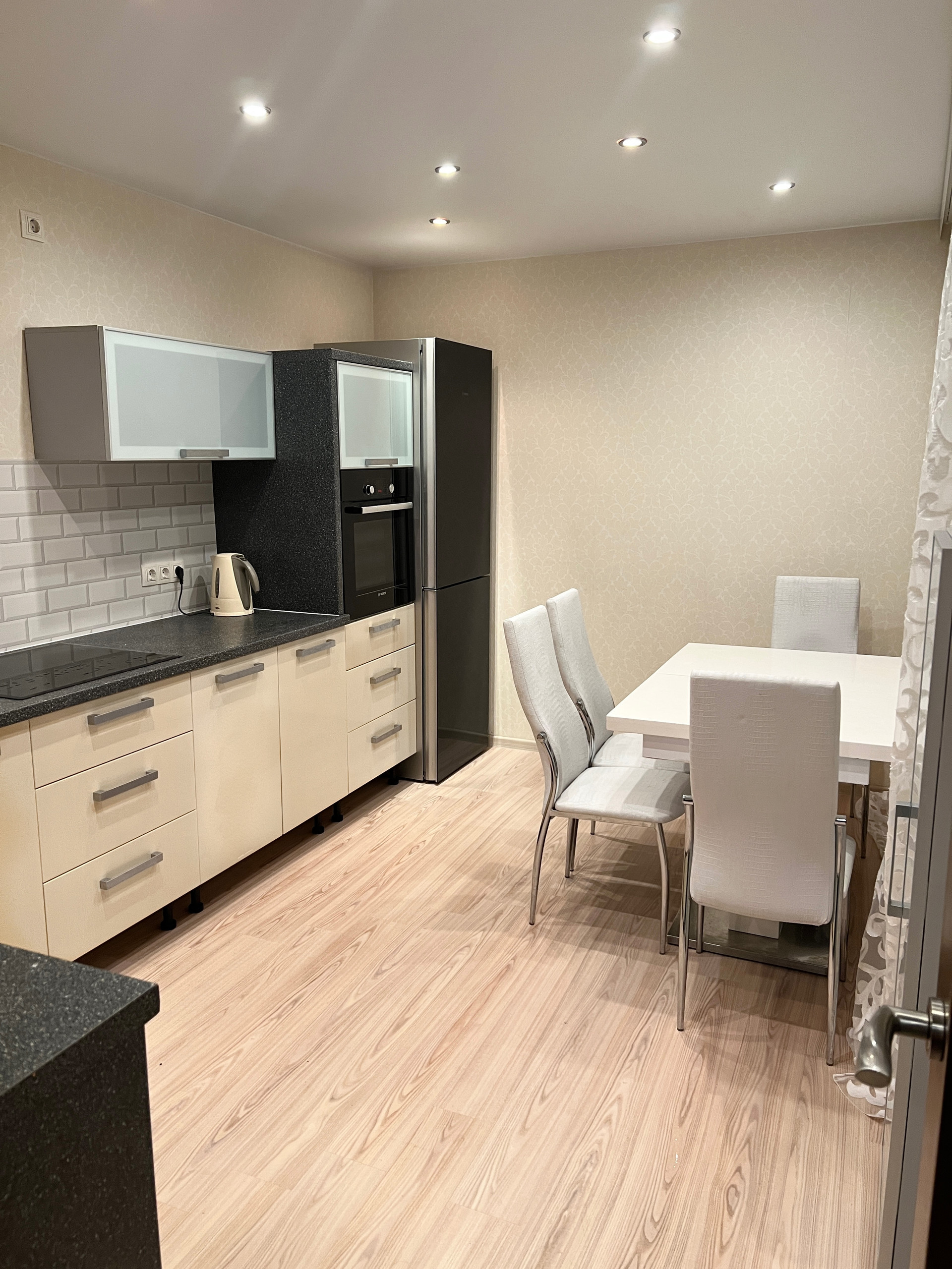 Оборудованна  бытовой техникой Bosch, Siemens: посудомойка, стиральная машина, холодильник , плита, духовка .