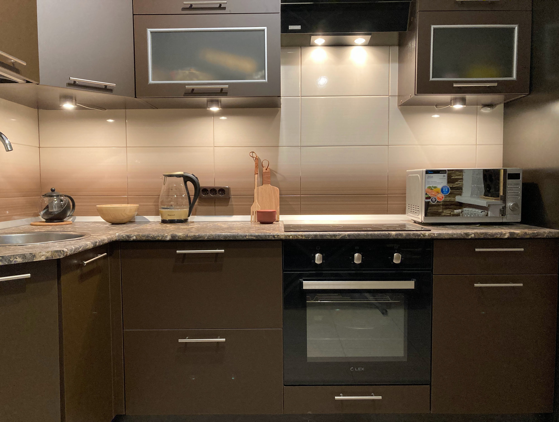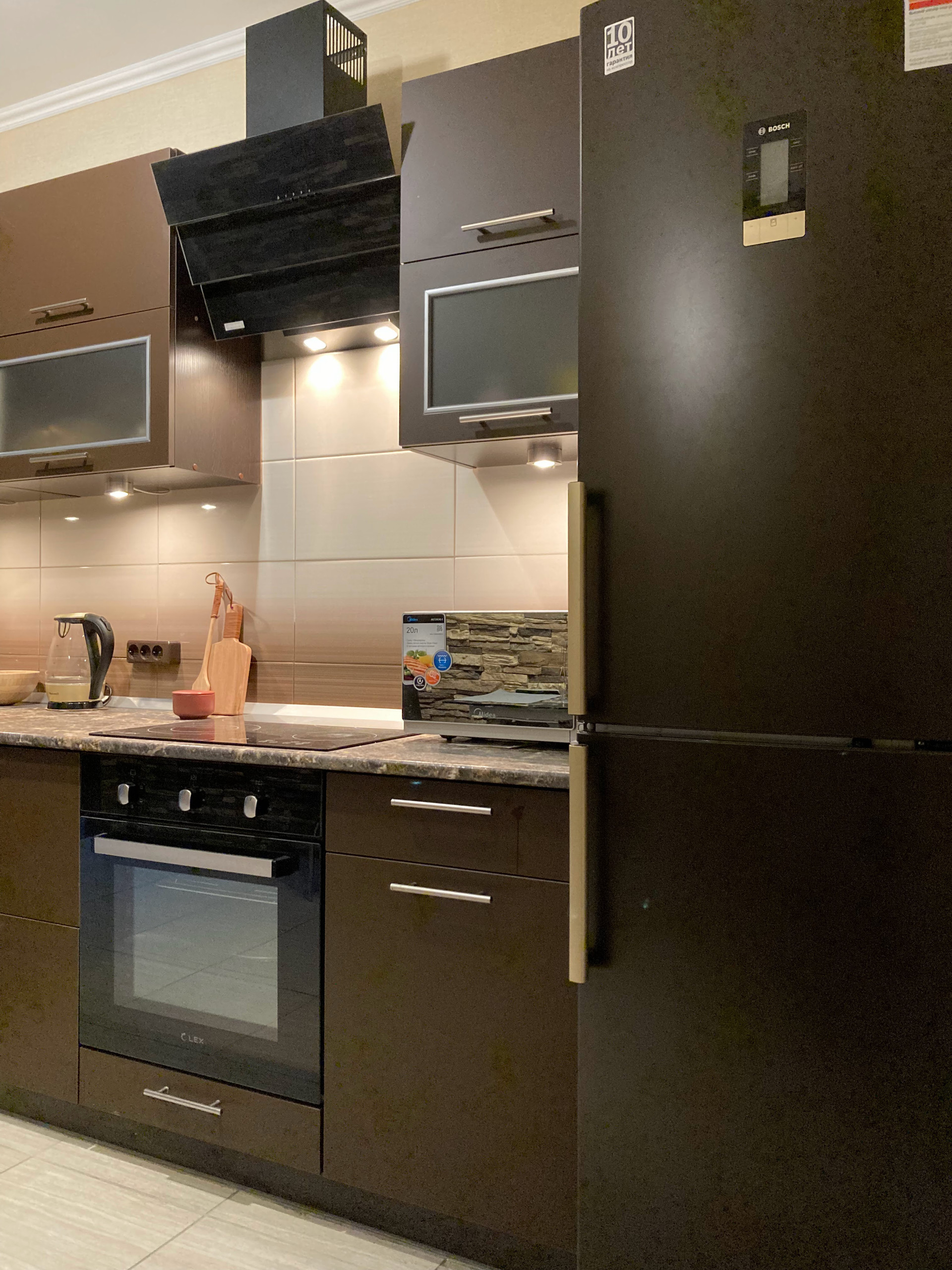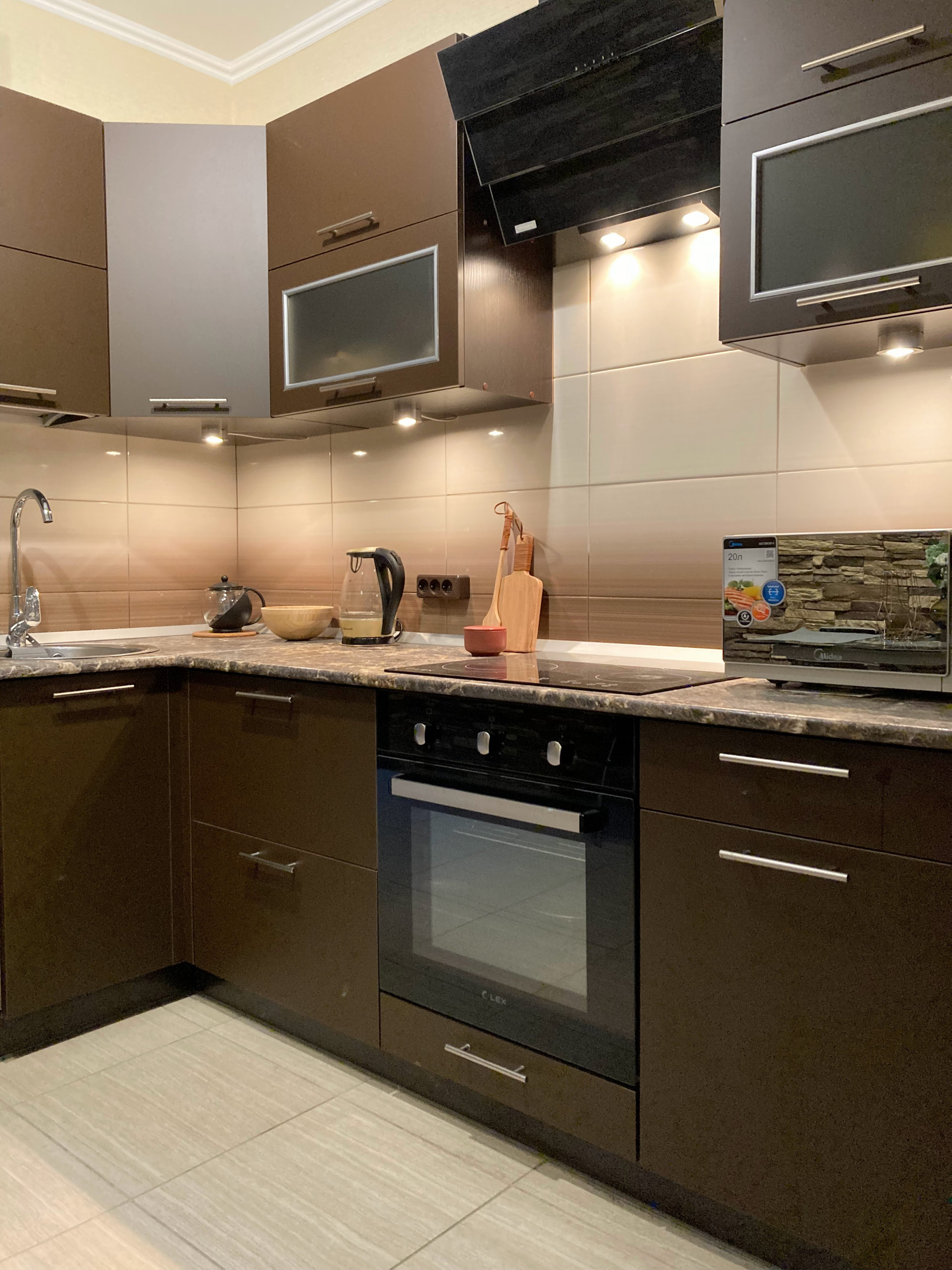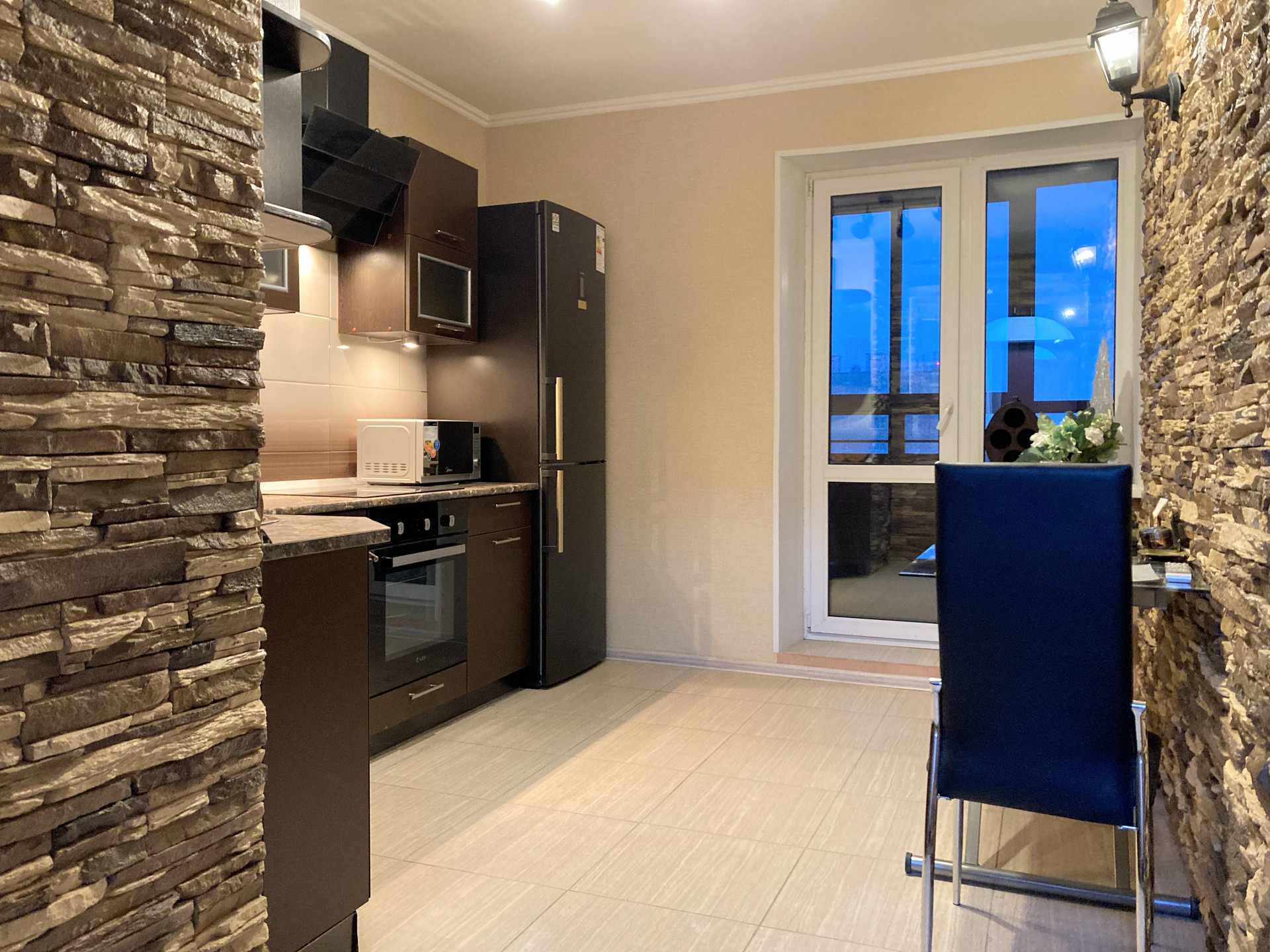 - полностью оборудованная (электрическая Плита керамика, СВЧ, Вытяжка, Холодильник, Плазменный Телевизор, Стиральная Машина, )