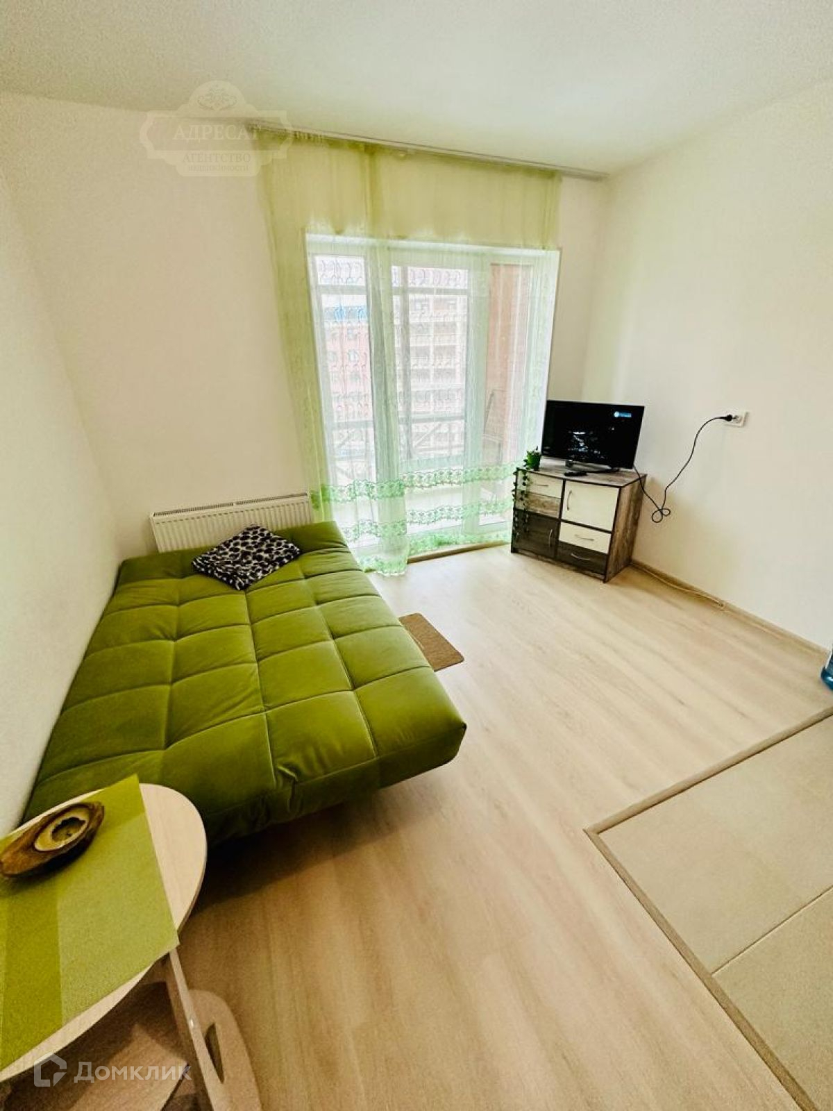 Квартира-студия с панорамными окнами, общей площадью 23 кв.м. + балкон 4 кв. м, расположена на 9 этаже.