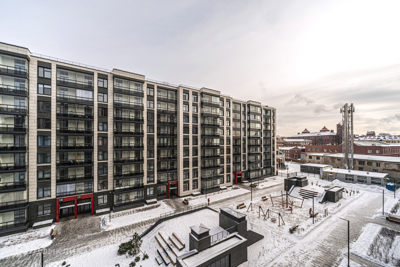 Жилой комплекс состоит из семи домов высотой по 9 этажей. Архитектура лаконична и элегантна: сдержанные цвета, строгие линии фасадов и симметрия в расположении корпусов