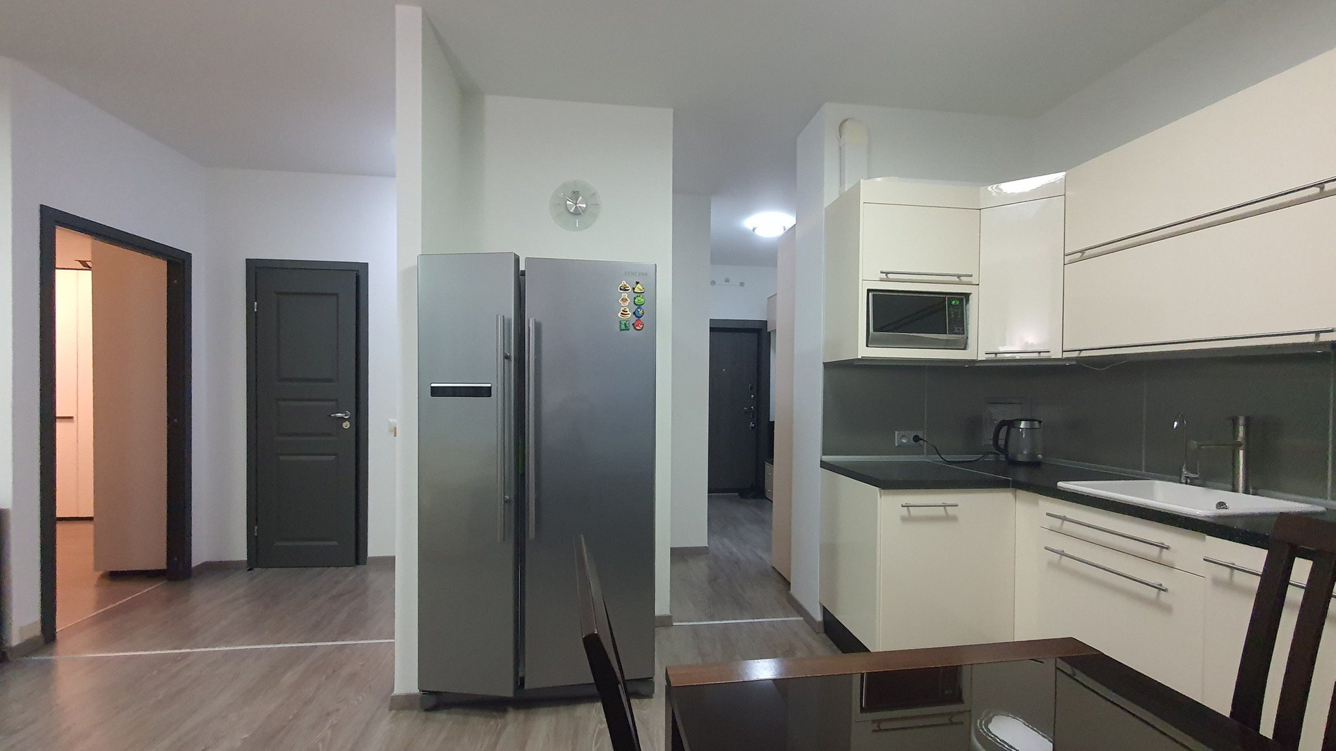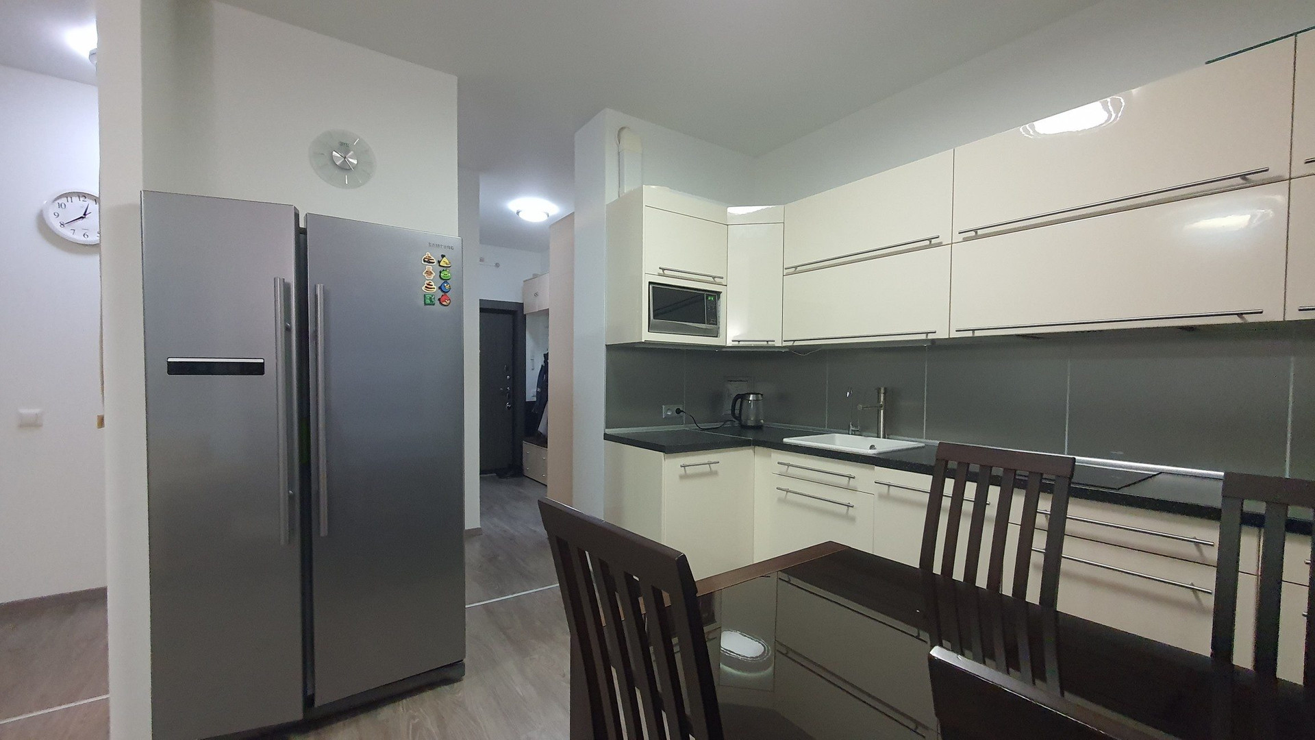 Кухня оснащена удобной мебелью и техникой, в том числе кондиционером, огромным холодильником, посудомойкой, микроволновкой.