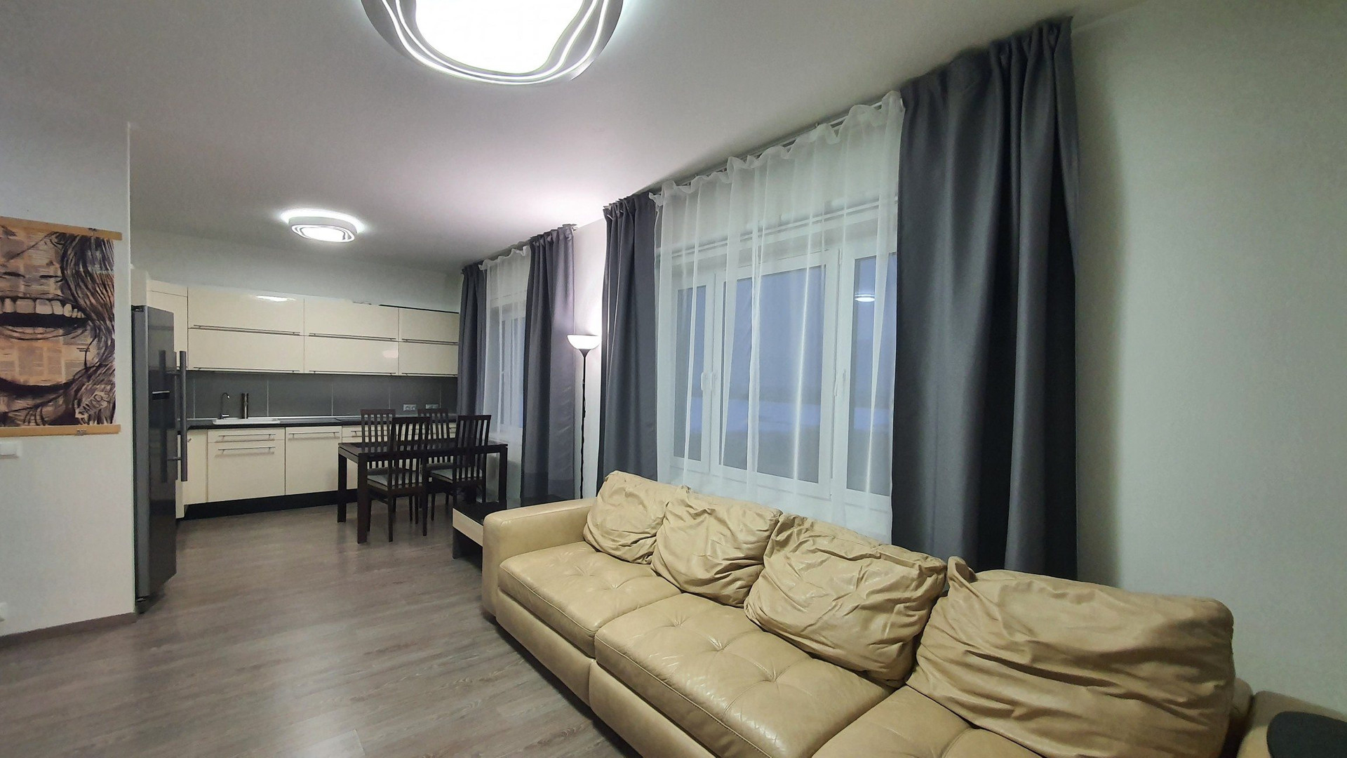 В гостиной 28 метров, совмещенной с кухней, РАСКЛАДНОЙ ДИВАН ИЗ НАТУРАЛЬНОЙ КОЖИ.