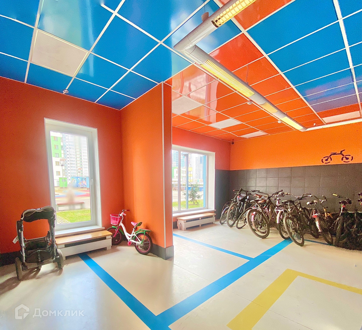 В доме спроектированы специальные места для хранения велосипедов, детских колясок, самокатов, а также отдельные помещения для мытья обуви и лап домашних животных.