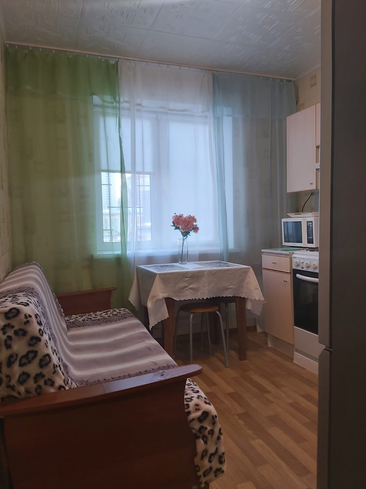 Кухня полностью оборудована кухонным гарнитуром, холодильником, плитой, вытяжкой, электрическим чайником, микроволновкой, столовыми приборами и посудой. Есть диван-книжка, раскладной поворотный стол (увеличивается в два раза) и два табурета. Для уборки квартиры есть все необходимые инструменты: швабры, пылесос.