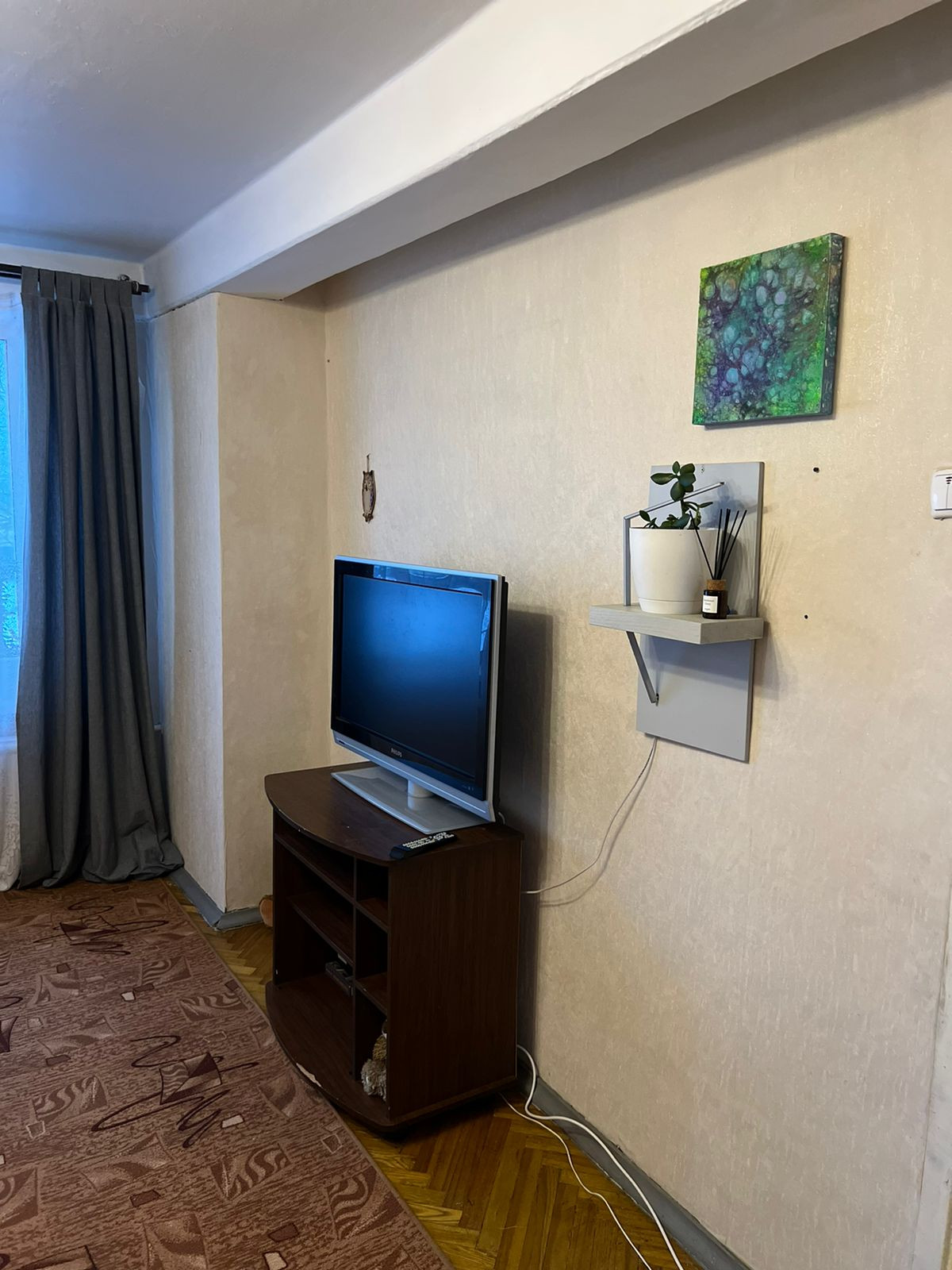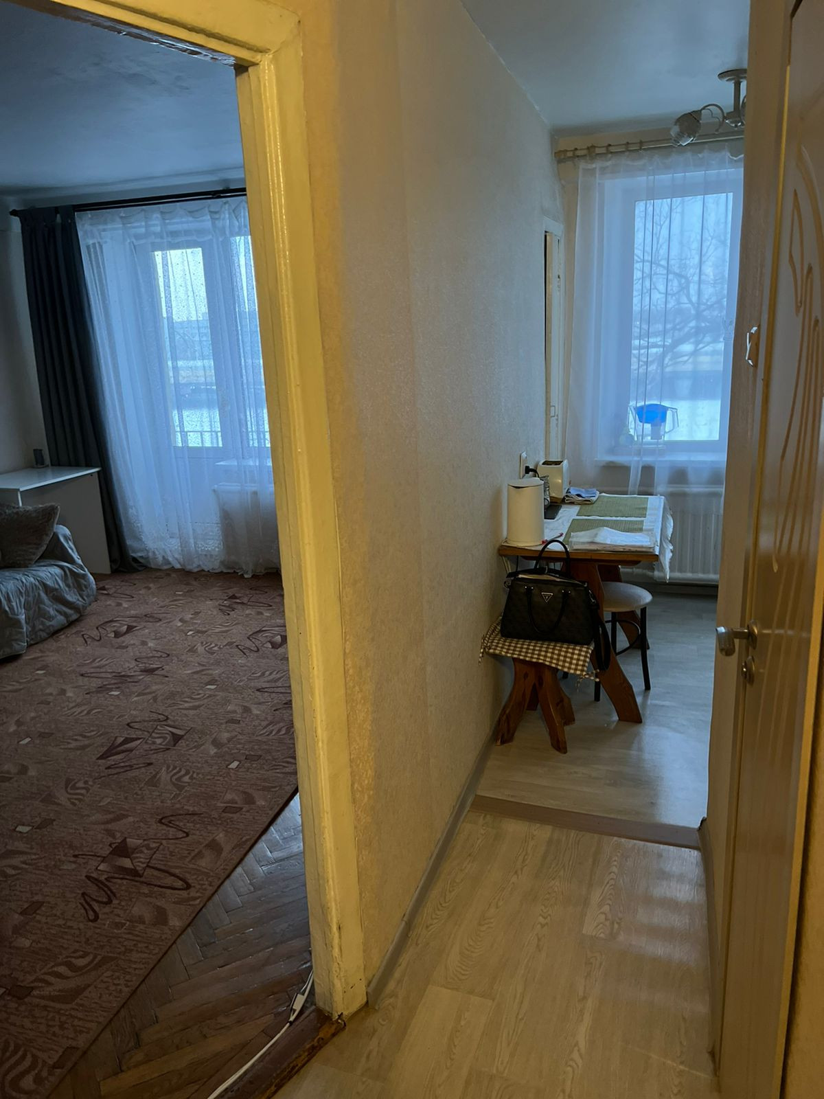 На полу линолеум, входная дверь обычная, балконов - 1, окна выходят на улицу.