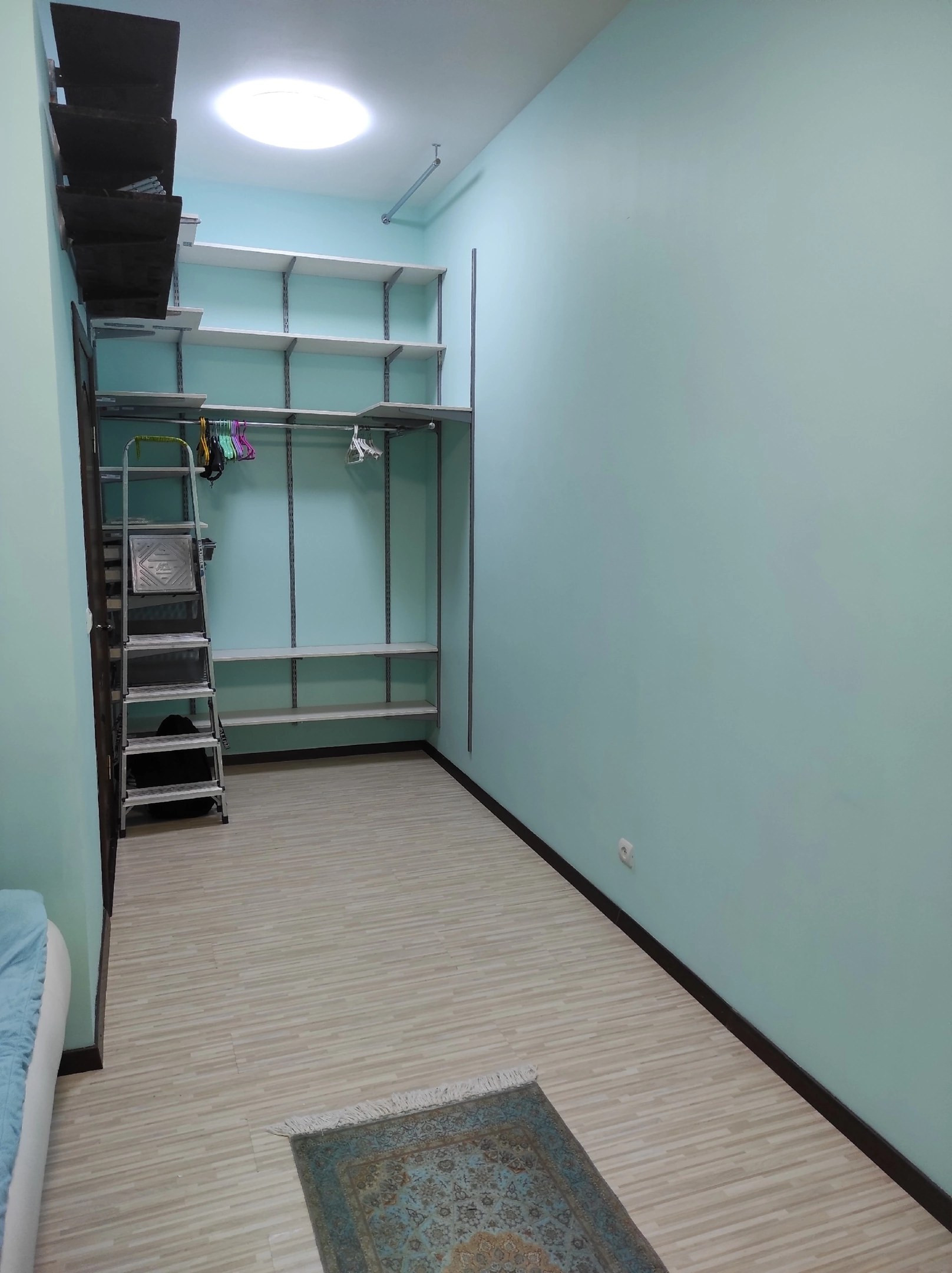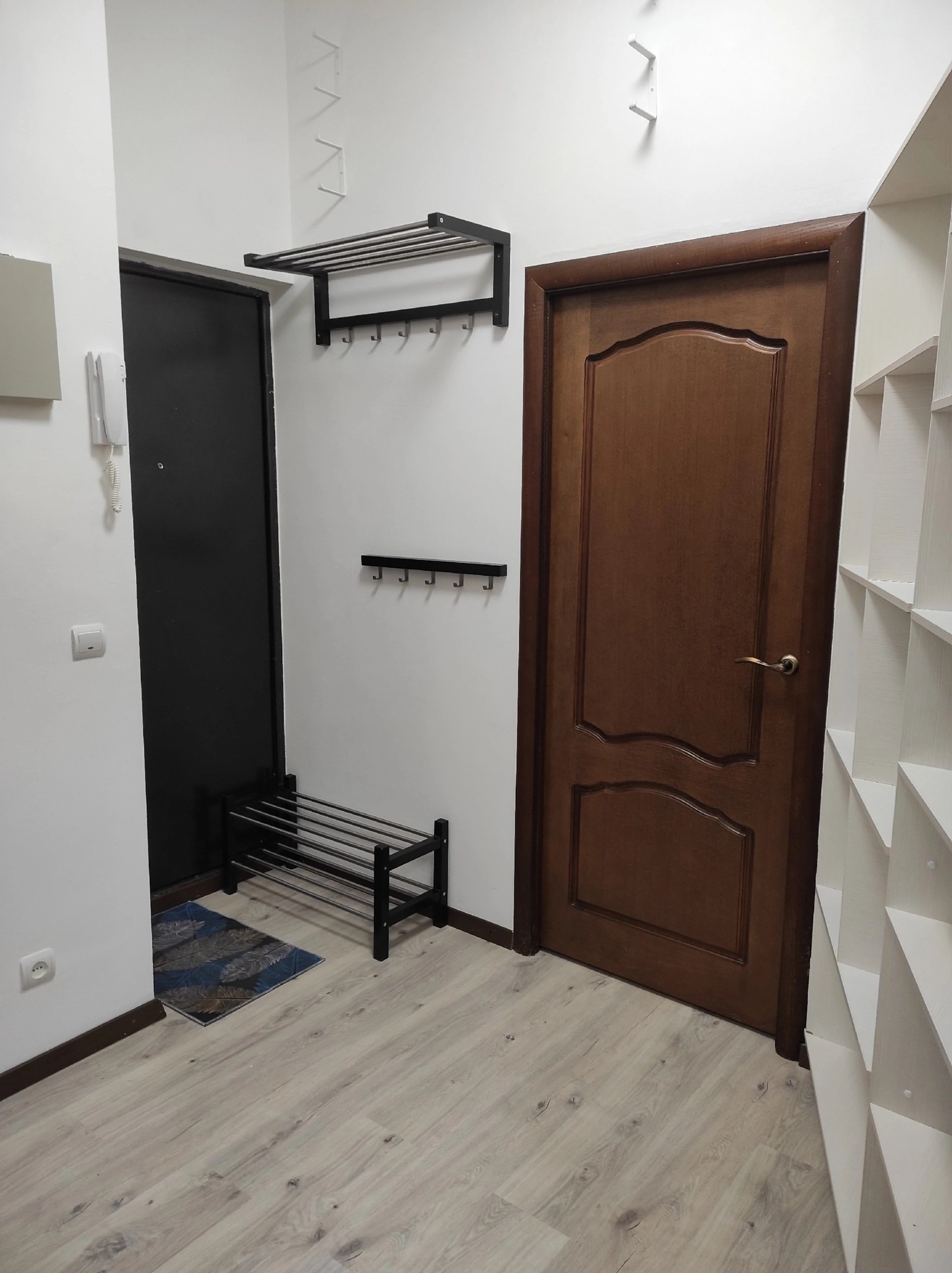 Пространство в квартире оптимизировано максимально, большое количество мест для хранения, есть крючки для лыж, на потолок можно установить подвесы под велосипеды.