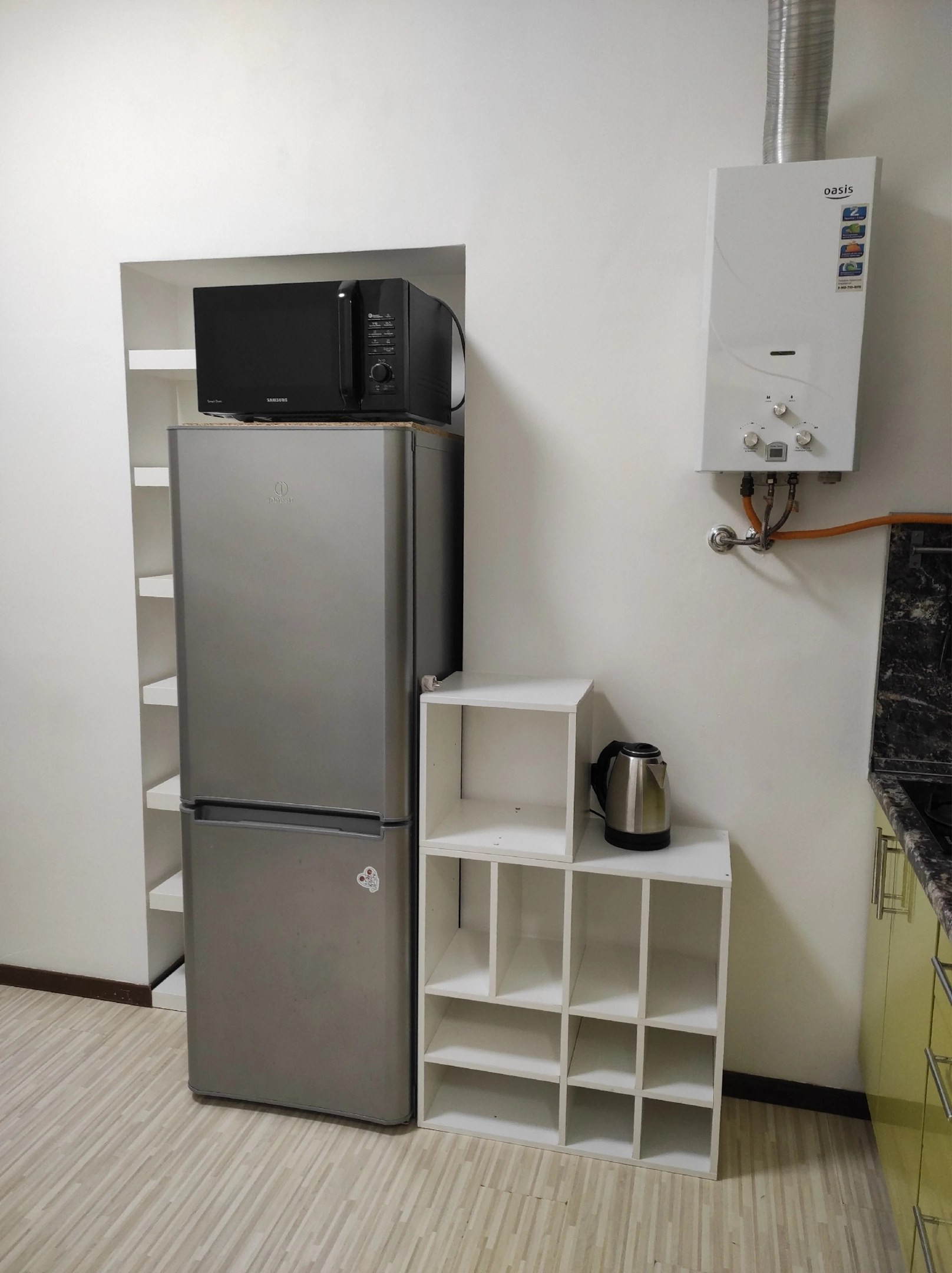 Кухня в квартире приближена к типажу кухни-гостинной и имеет раскладной диван для гостей.