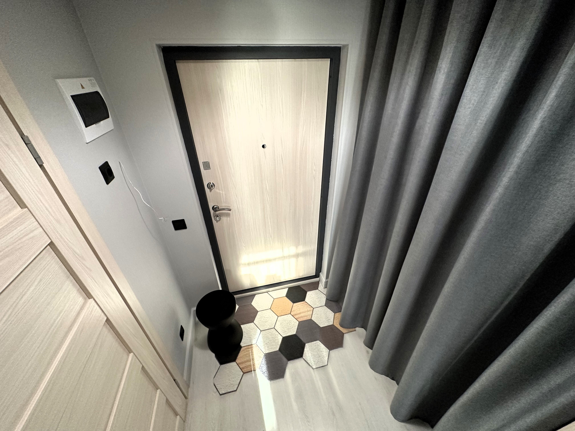 •    открытая система хранения в коридоре за занавеской и шкаф в комнате