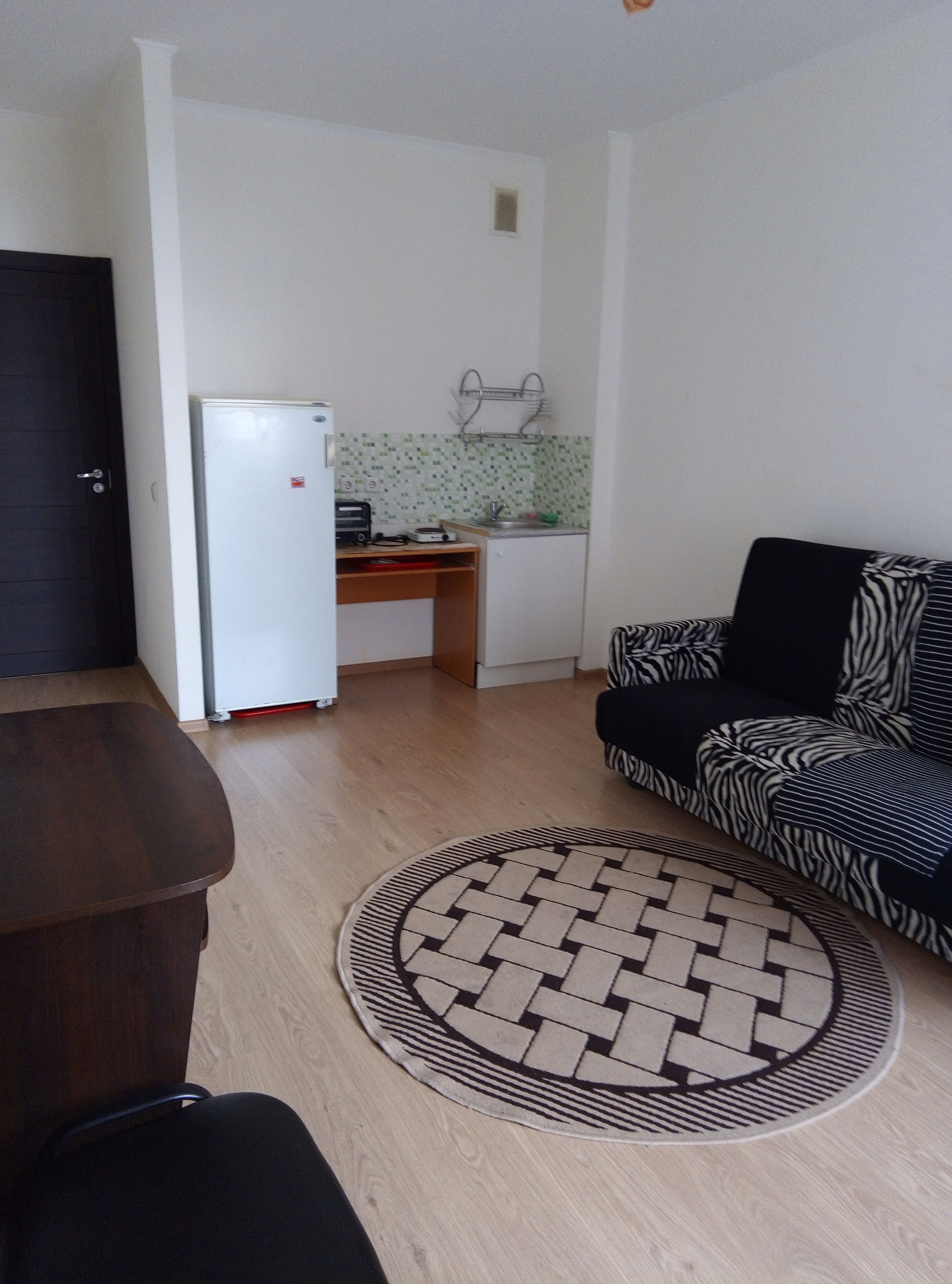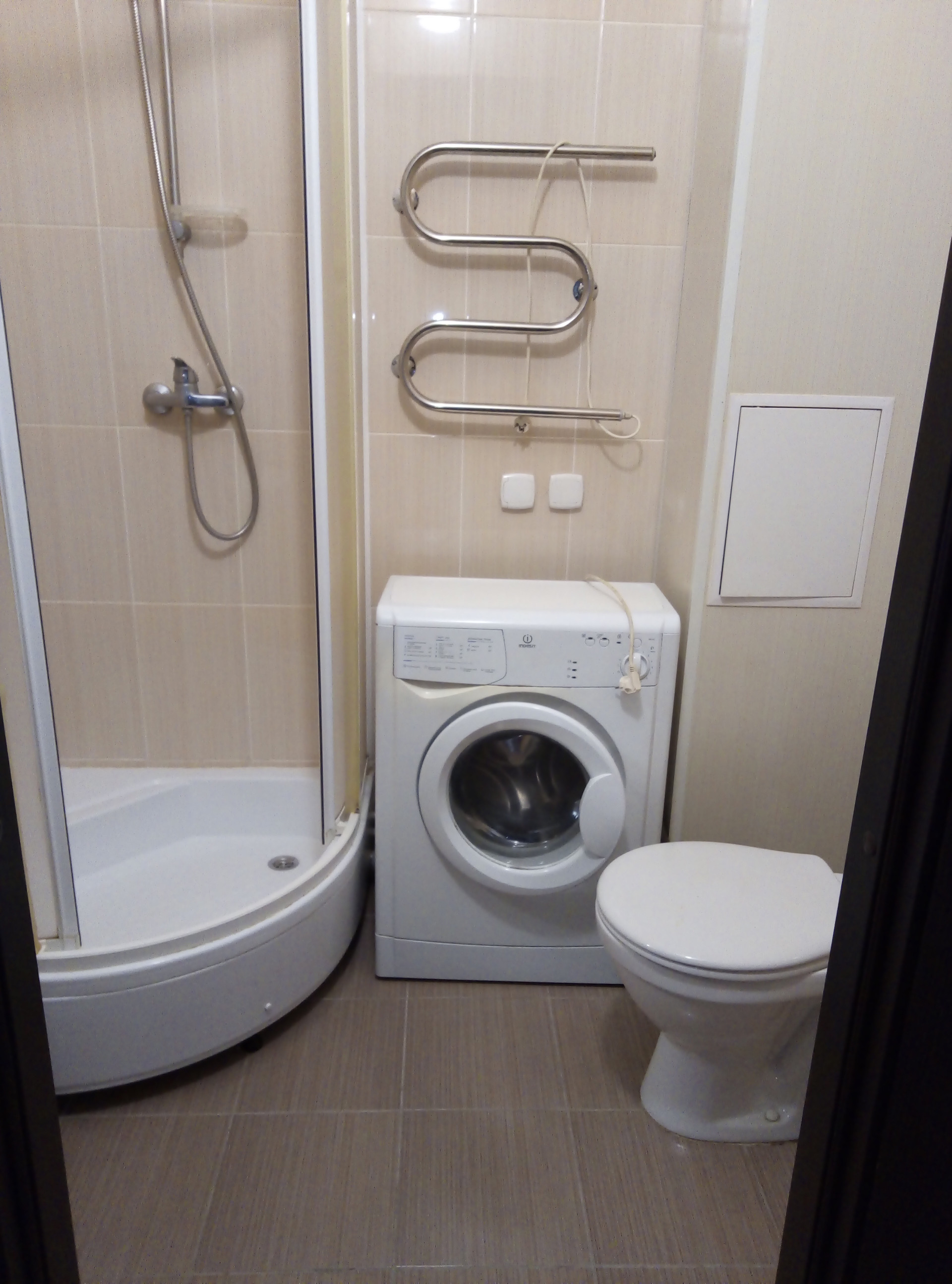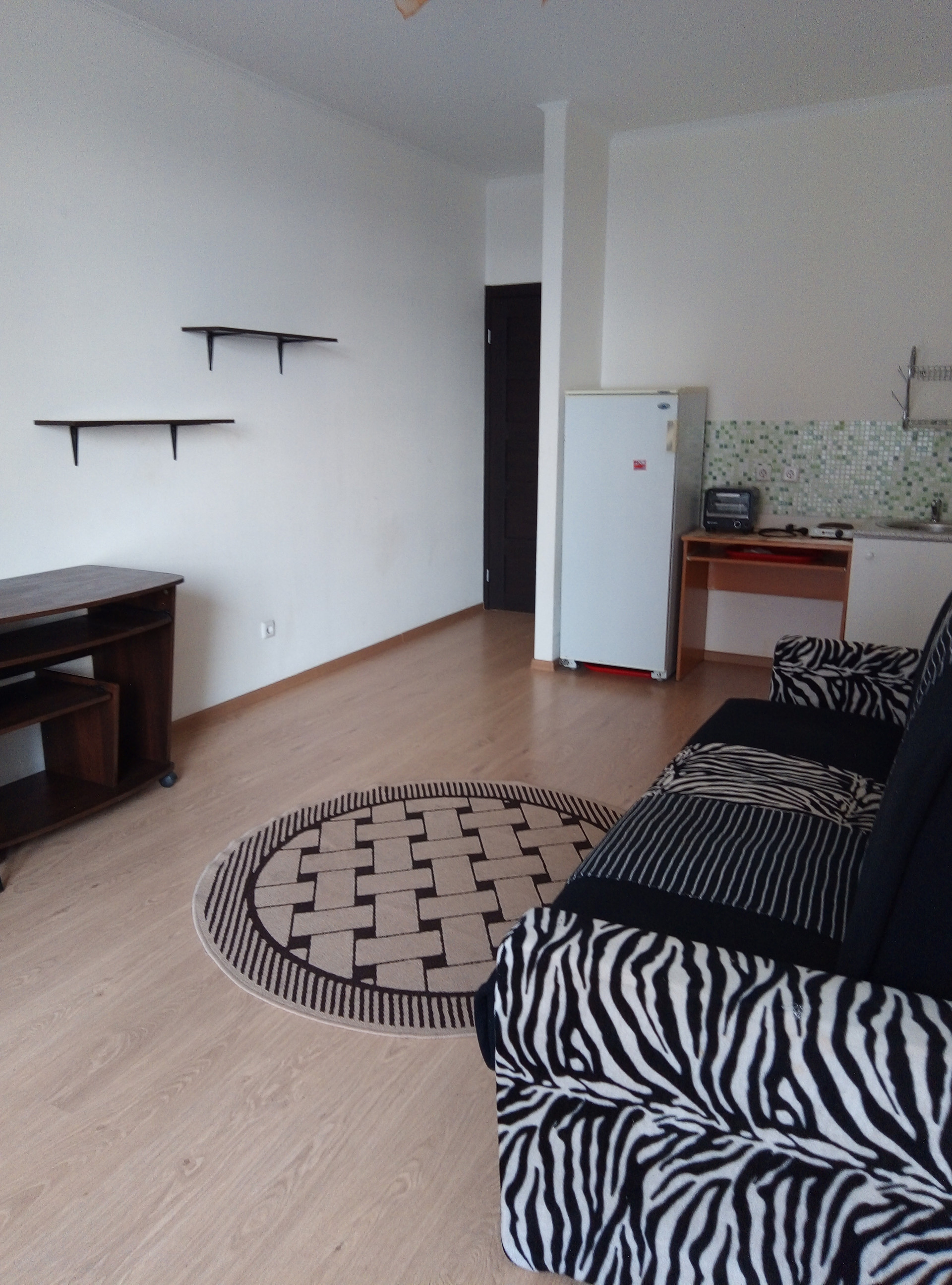 В ванной стиральная машина, душевая кабина, унитаз, тумба с раковиной, есть раскладной диван двухспальный, шкаф-купе, портативная электрическая комфорка, компьютерный-телевизорный столик, холодильник, сушилка для белья.