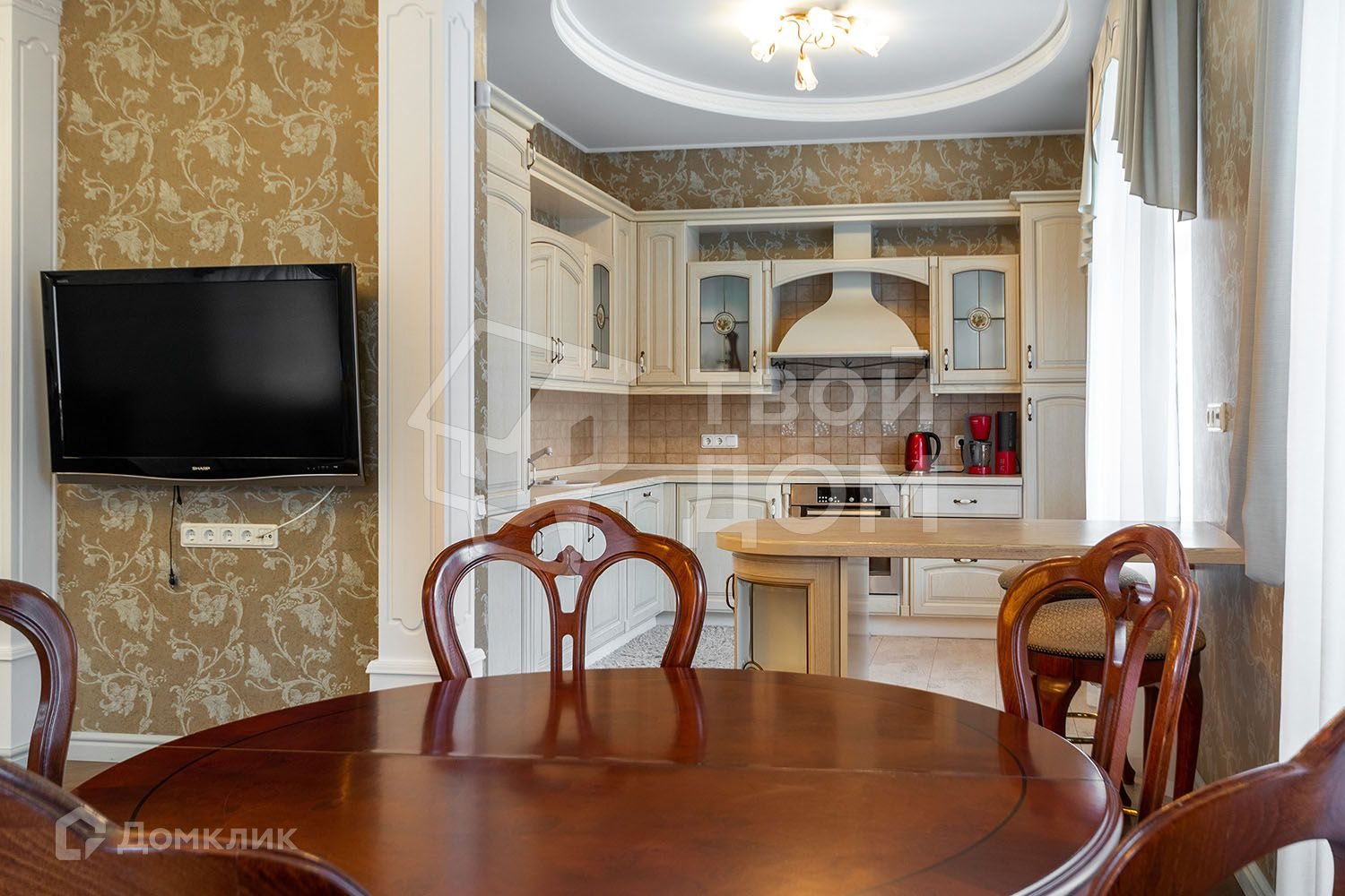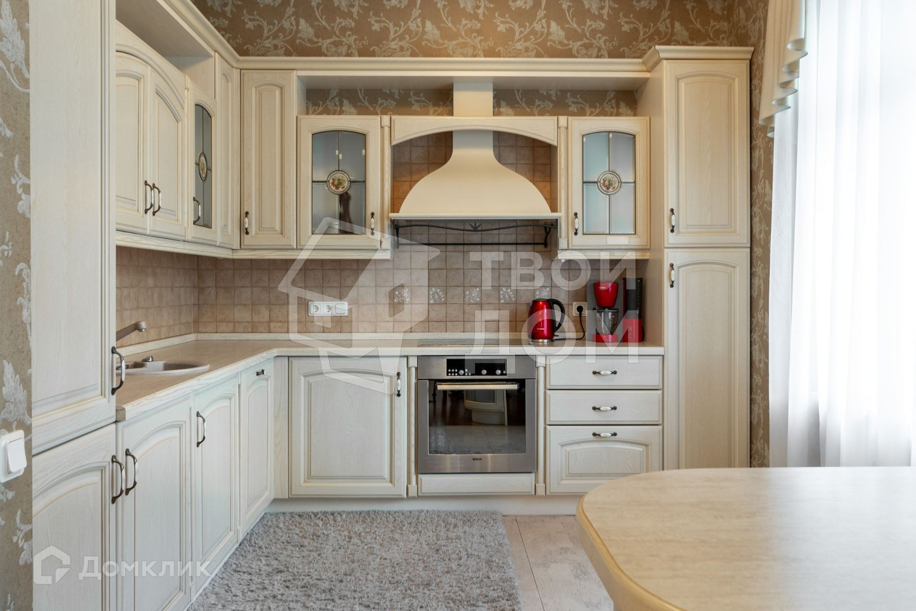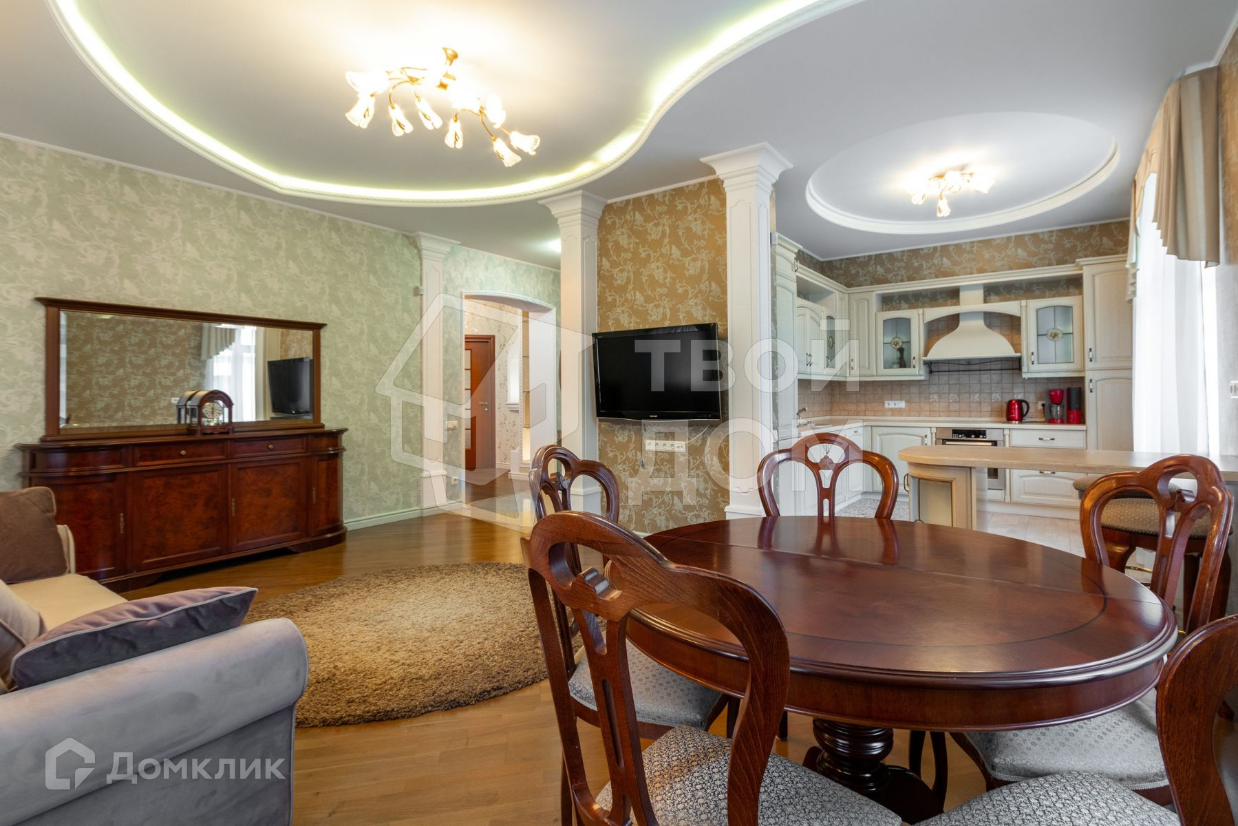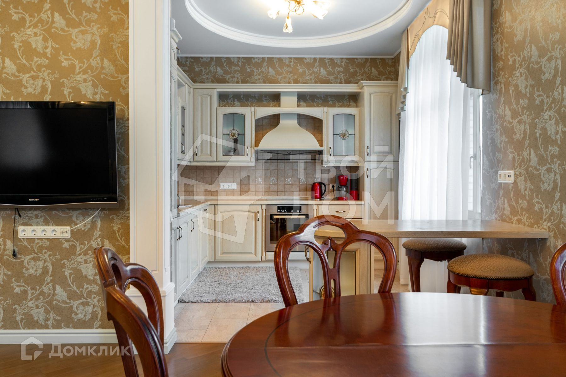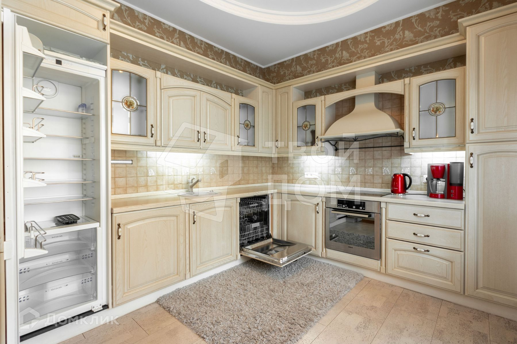 Техника и оборудование: посудомоечная машина, холодильник, варочная поверхность, духовой шкаф, телевизор, стиральная машина.
