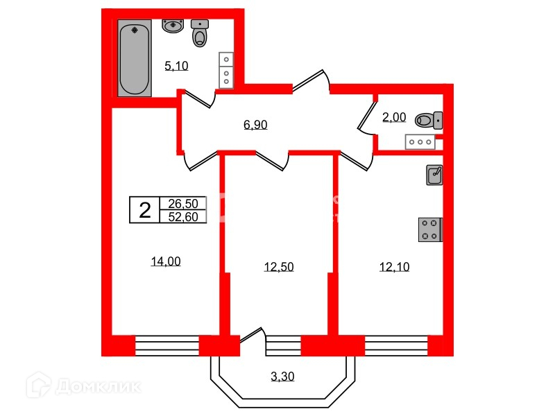 Общая площадь 52.6 м2