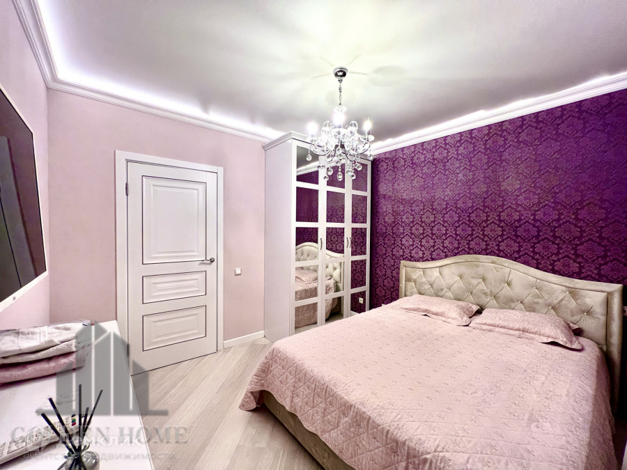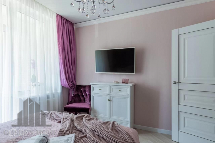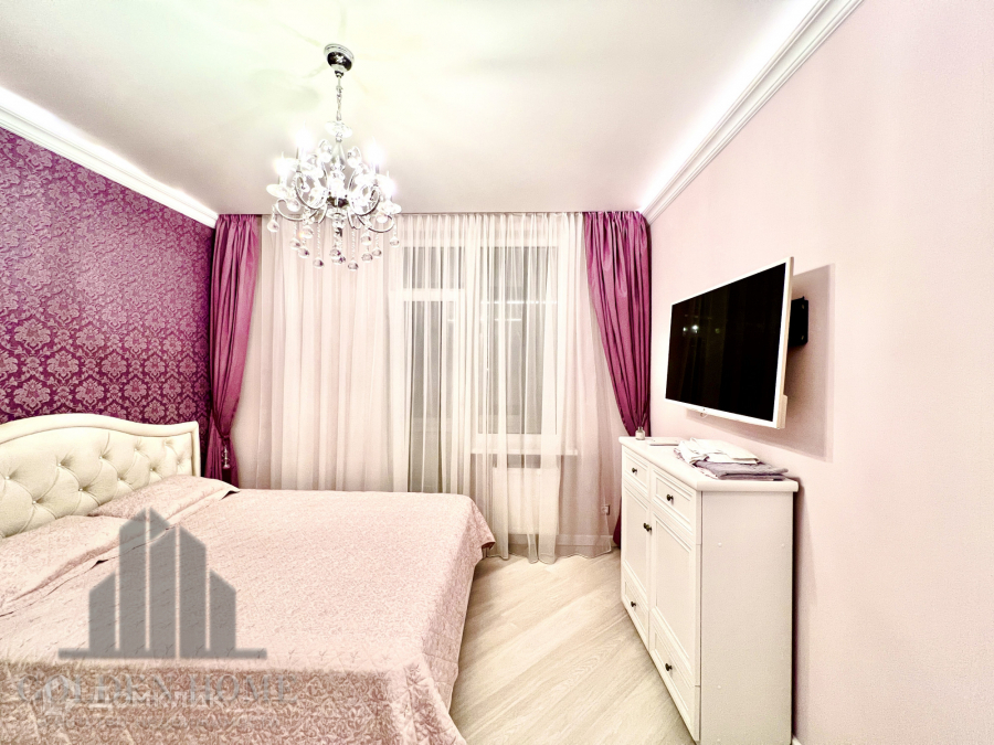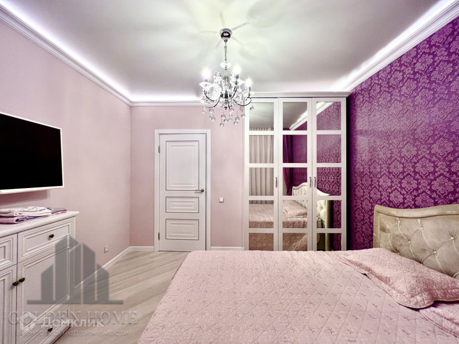 Большой вместительный зеркальный шкаф, двуспальная кровать с ортопедическим матрасом, комод, телевизор.