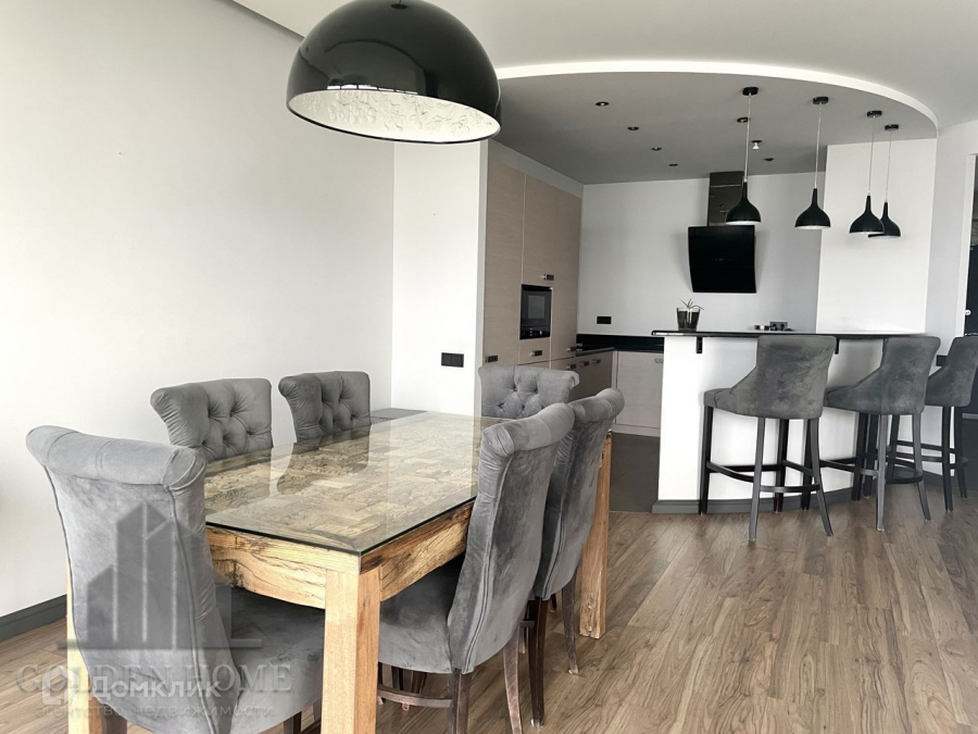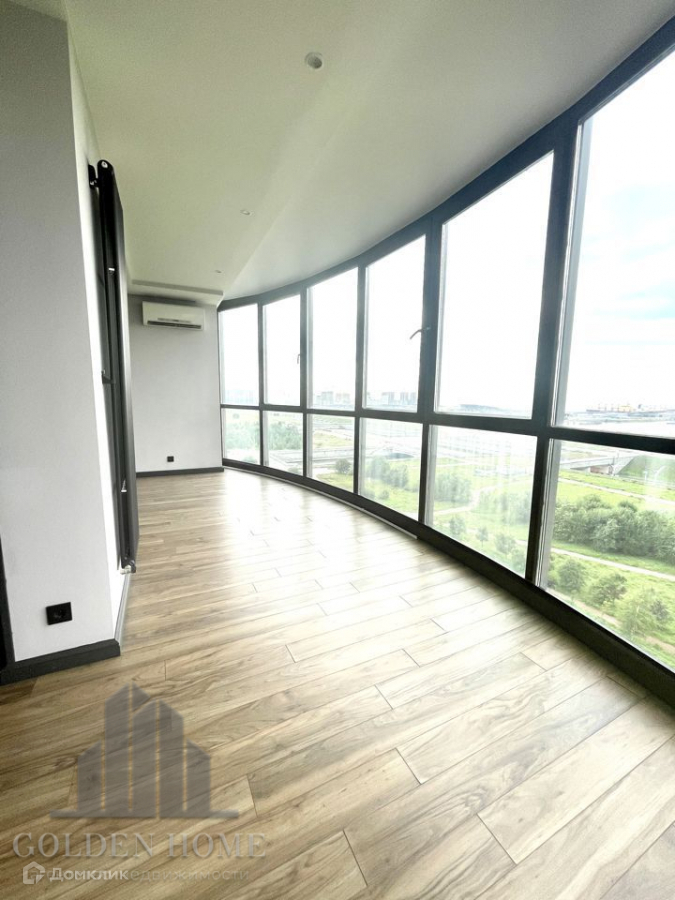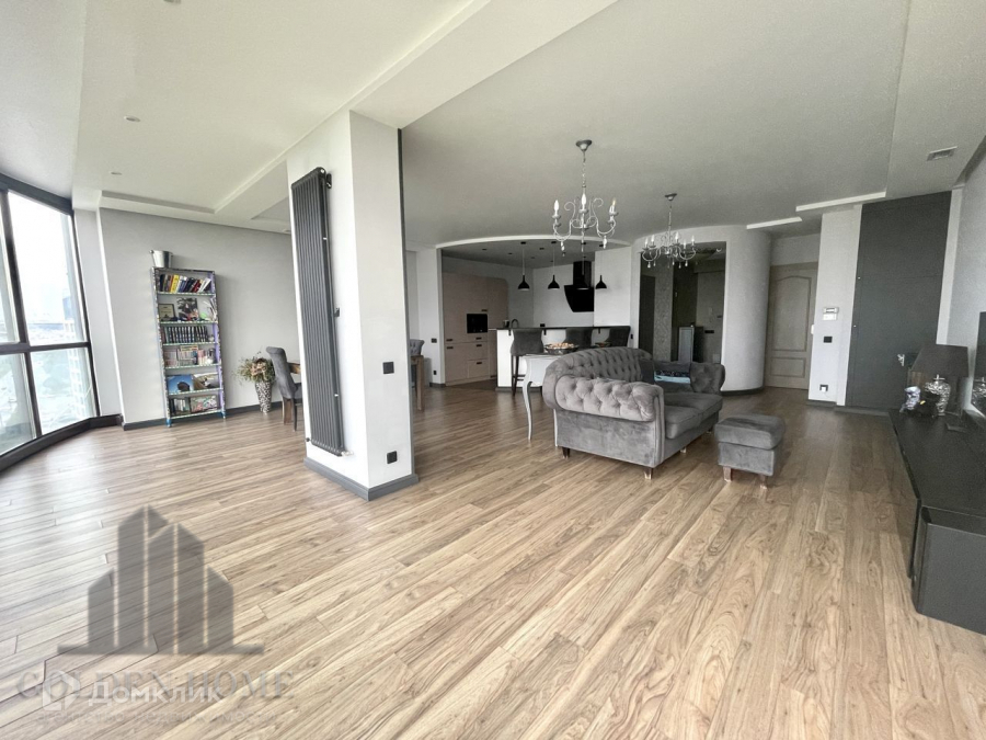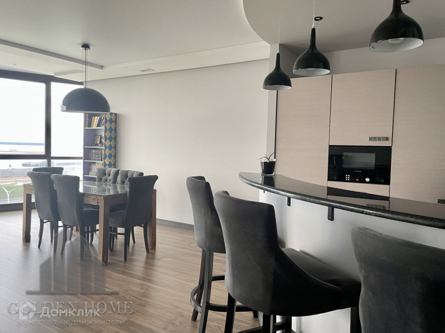 Просторная гостиная с кухней 50 метров, 1 спальня, вместительная гардеробная, кабинет с видовыми окнами в пол, совмещенная ванная комната, прихожая.