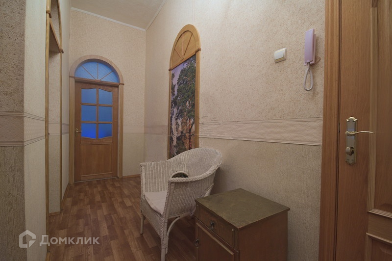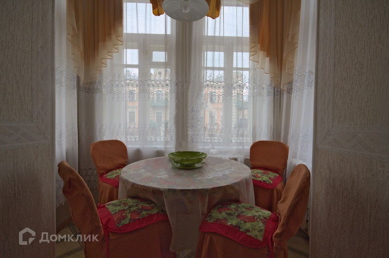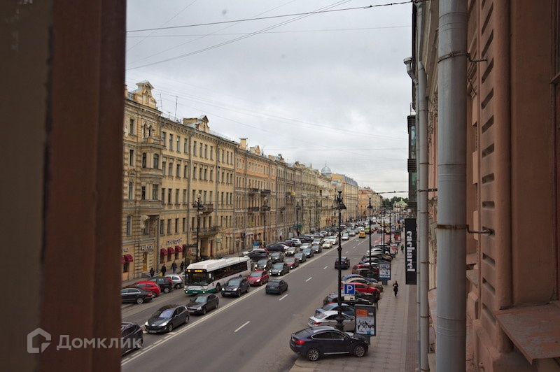 На полу паркет, линолеум и ковролин, входная дверь двойная железная, все окна и окна эркера выходят на Невский проспект.