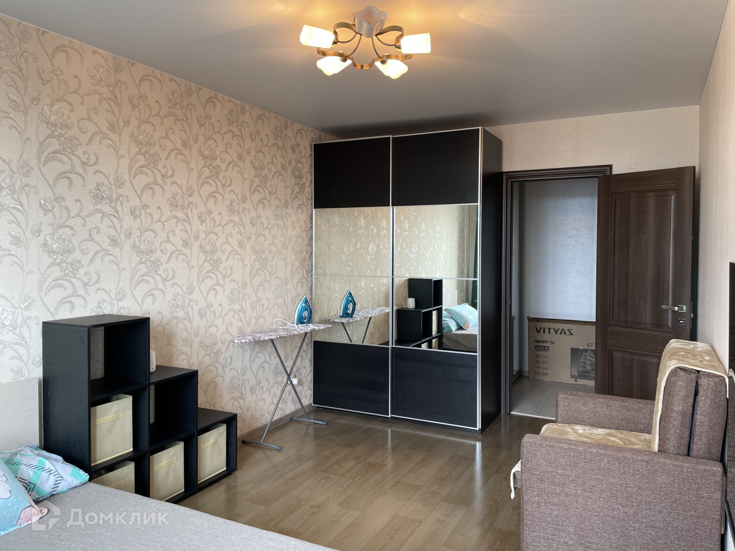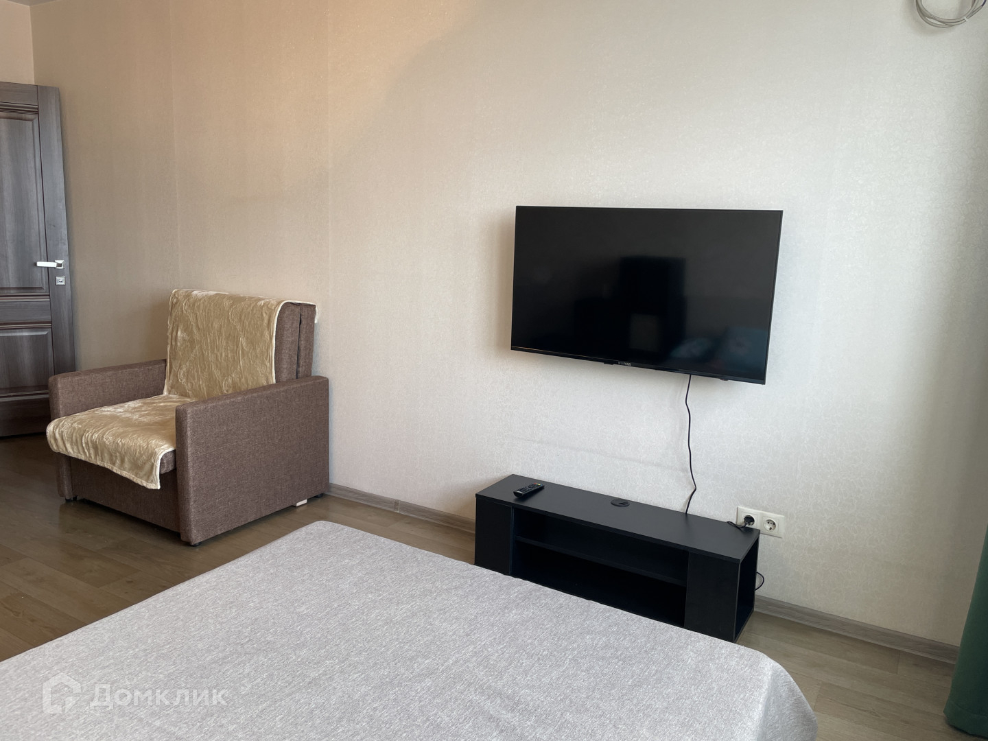 в комнате: двуспальная кровать, места для хранения одежды и прочих вещей, телевизор, кресло;