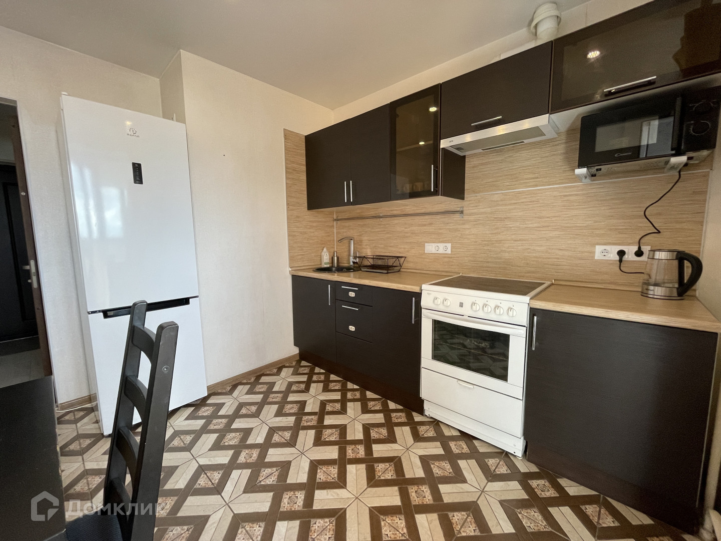 кухня с встроенной техникой: духовой шкаф, электрическая плита, вытяжка, микроволновая печь, куплен новый холодильник.