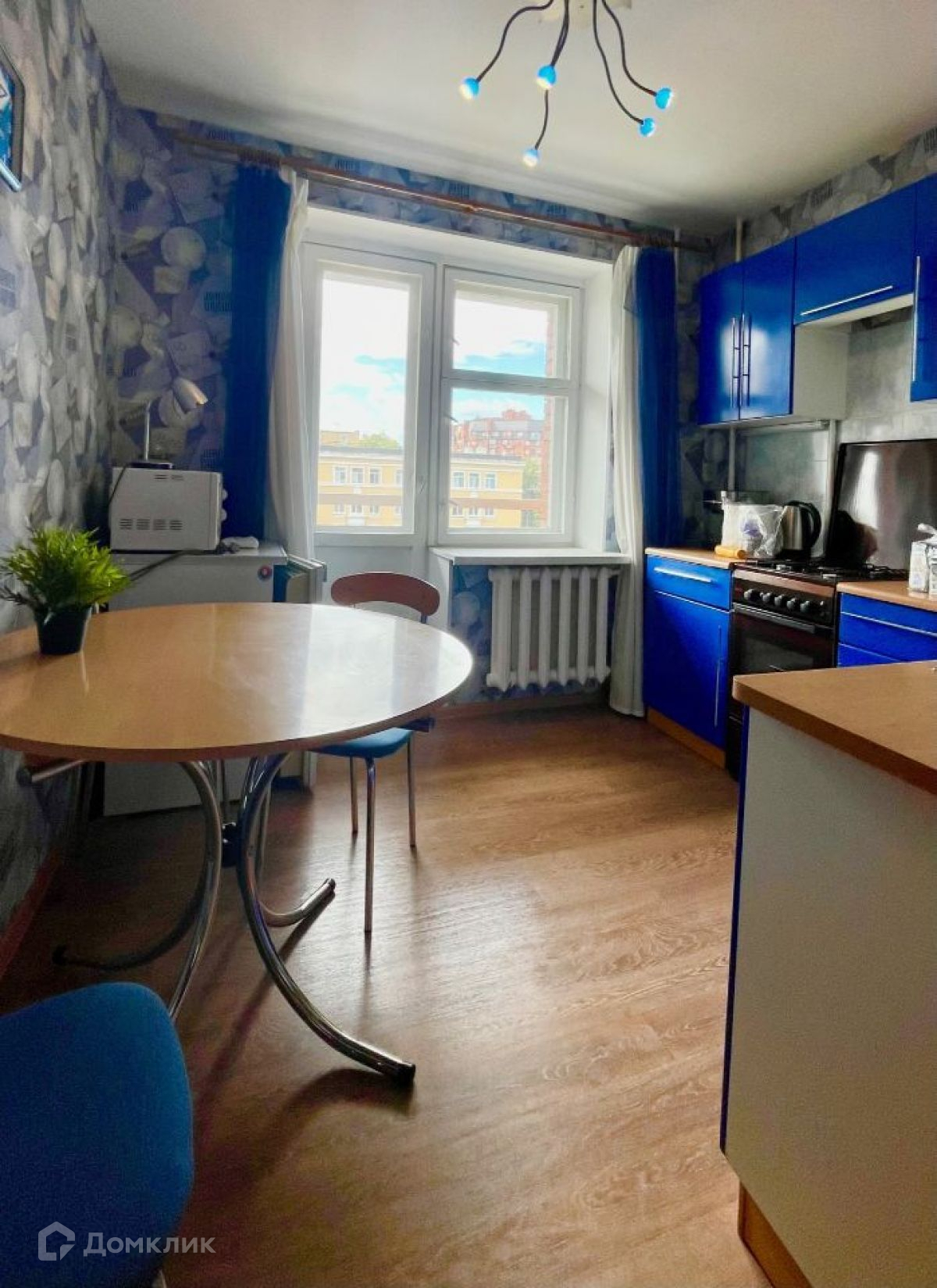 Кухонный гарнитур, печь с духовкой, холодильник, микроволновая печь, обеденный стол, стулья выход на балкон