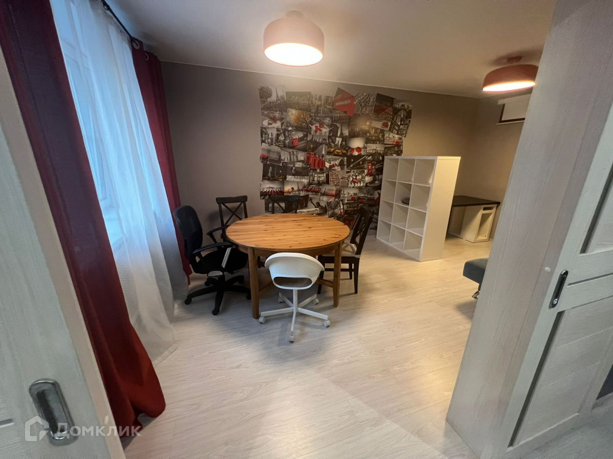 - из кухни можно попасть в комнату, которая используется как столовая. В этой же комнате выделено место под рабочую зону. Имеется диван, который можно использовать как дополнительное спальное место.