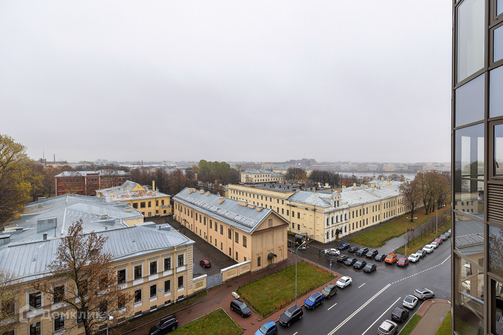 Просторная лоджия площадью 6.5 м² с панорамным остеклением открывает вид на Неву и центр Петербурга.