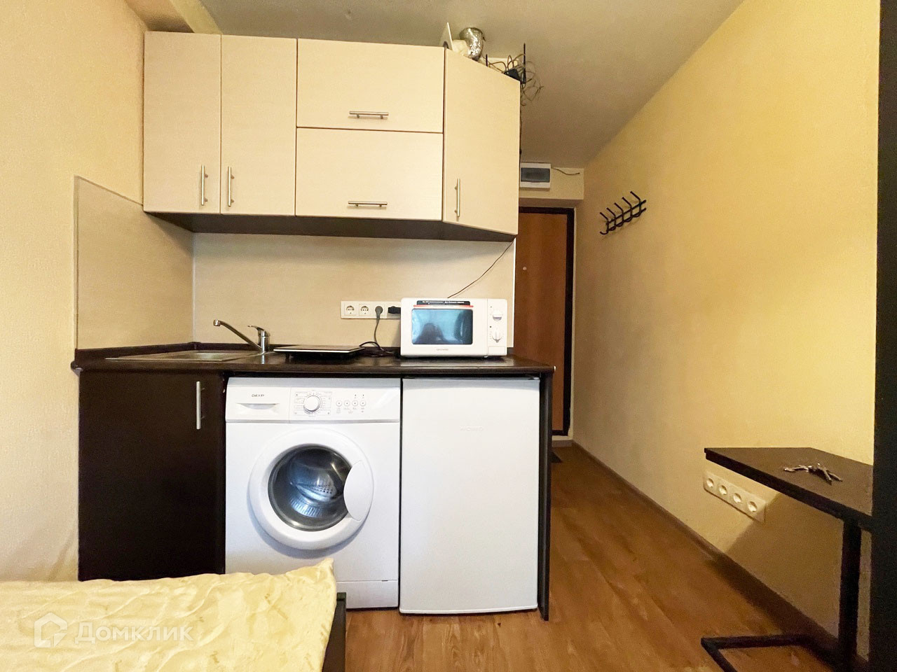 Кухня, плита, холодильник, стиральная машина, микроволновая печь, кровать, шкаф.