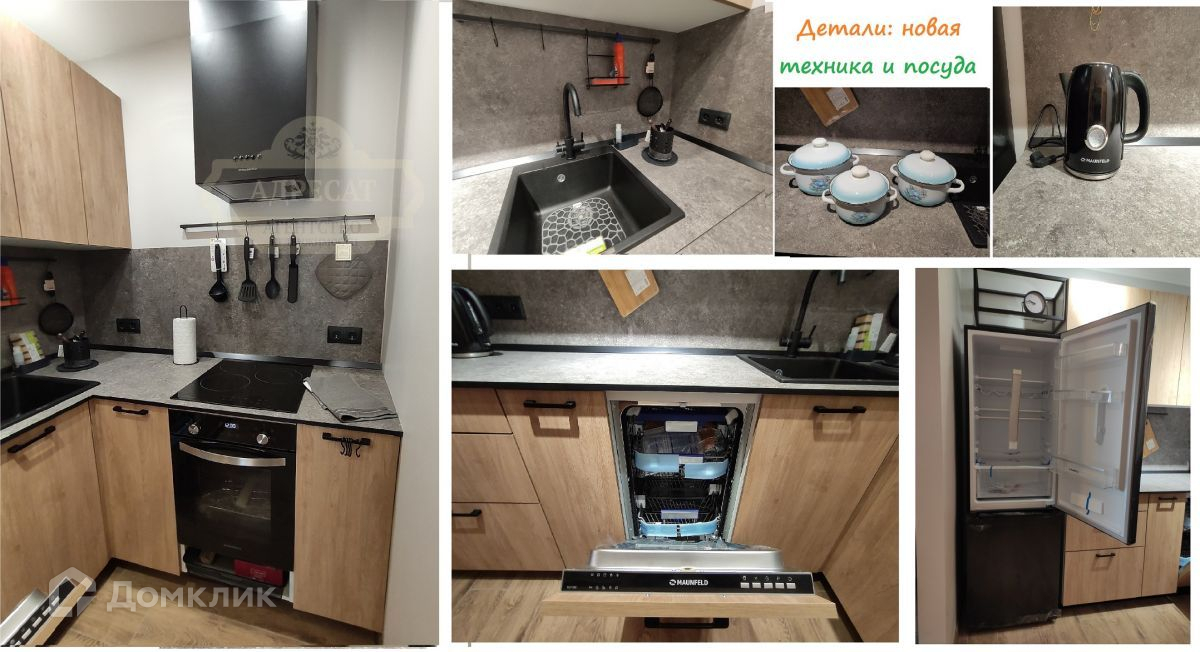 Техника: телевизор, холодильник, варочная панель, духовой шкаф, посудомоечная машина, вытяжка, стиральная машина.
