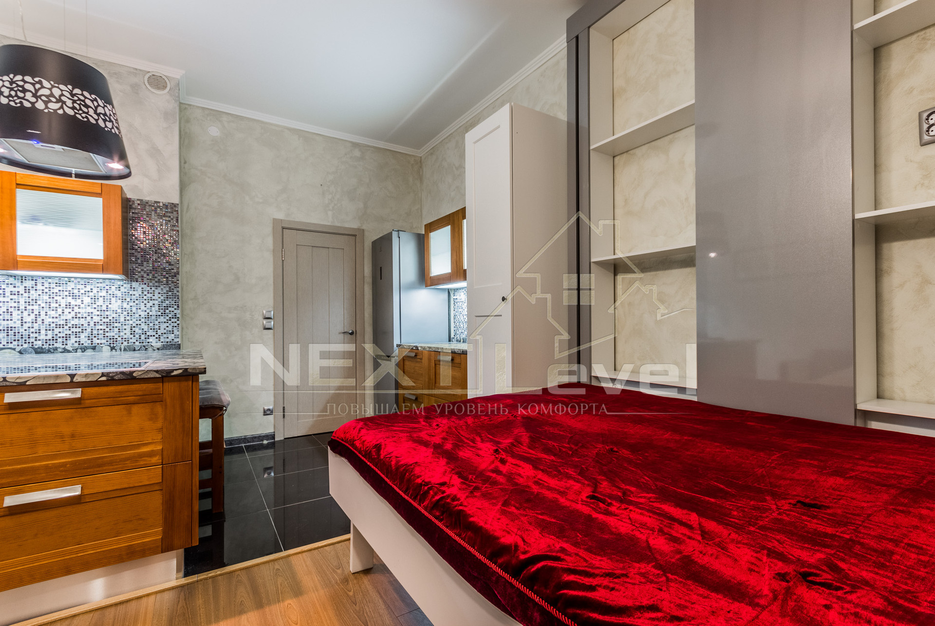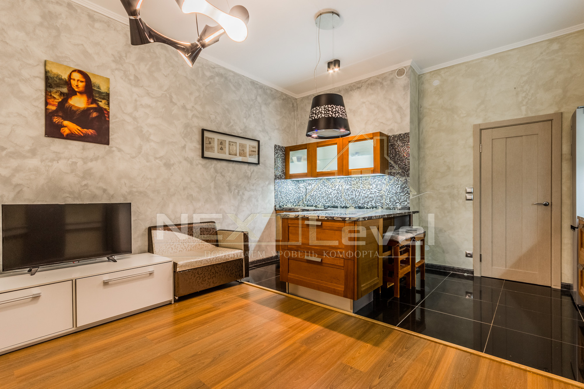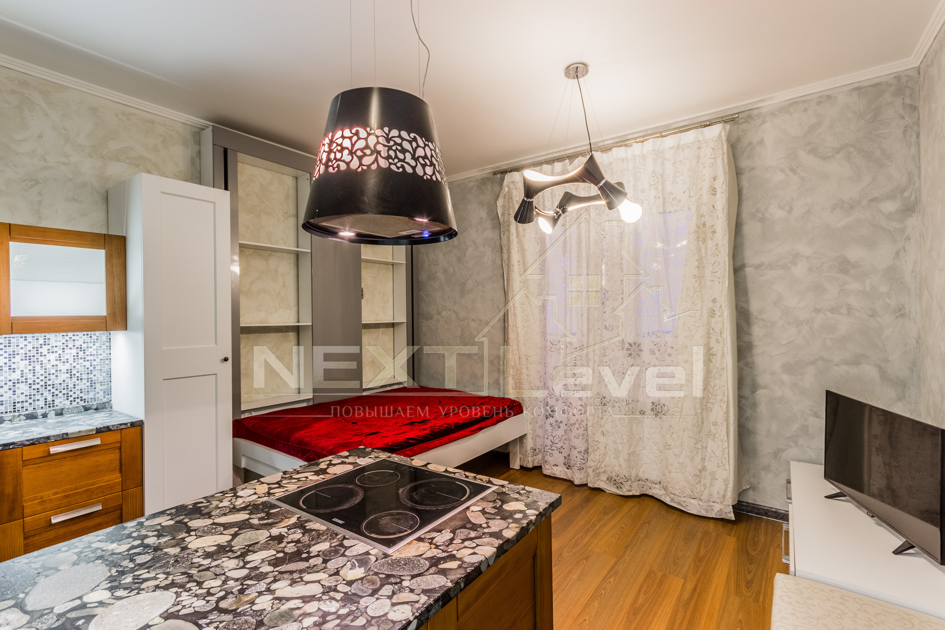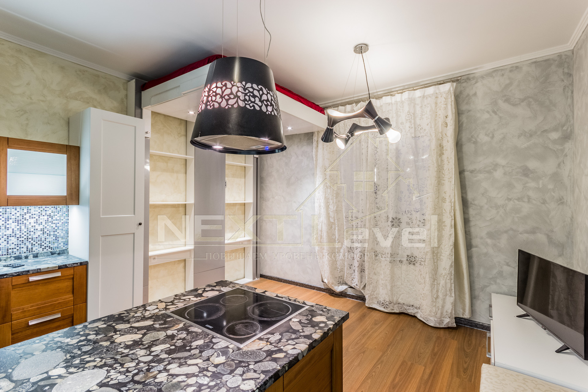 Квартира полностью меблирована, есть вся необходимая бытовая техника: кровать-трансформер полностью убирается под потолок одним движением руки, итальянская кухня, холодильник, варочная, вытяжка, посудомоечная и стиральная машины, мультиварка MOULINEX, телевизор.