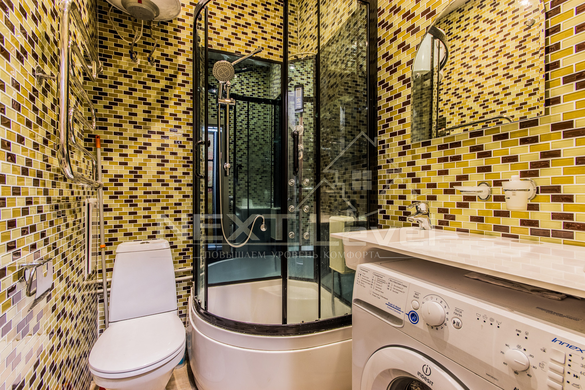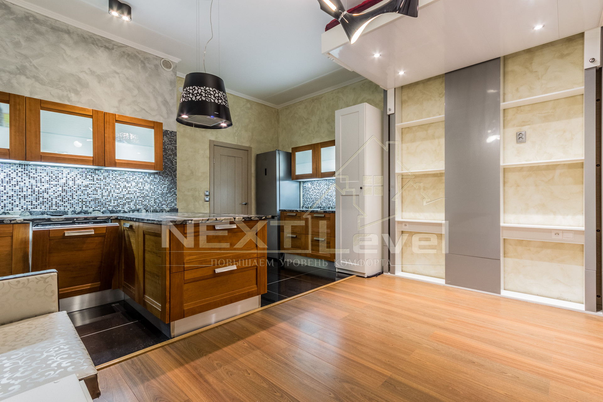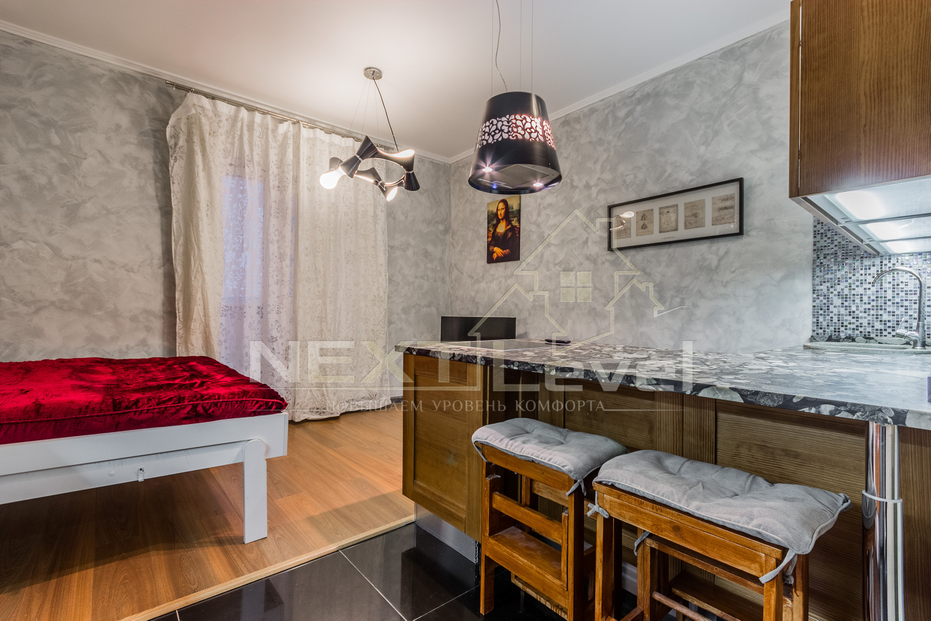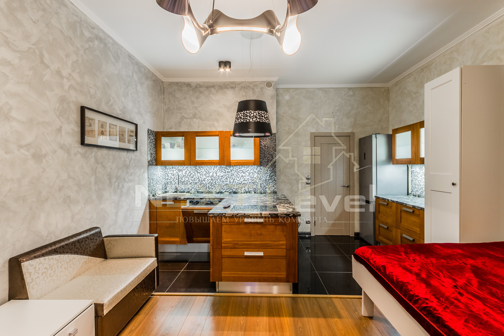 Квартира полностью меблирована, есть вся необходимая бытовая техника: кровать-трансформер полностью убирается под потолок одним движением руки, итальянская кухня, холодильник, варочная, вытяжка, посудомоечная и стиральная машины, мультиварка MOULINEX, телевизор.