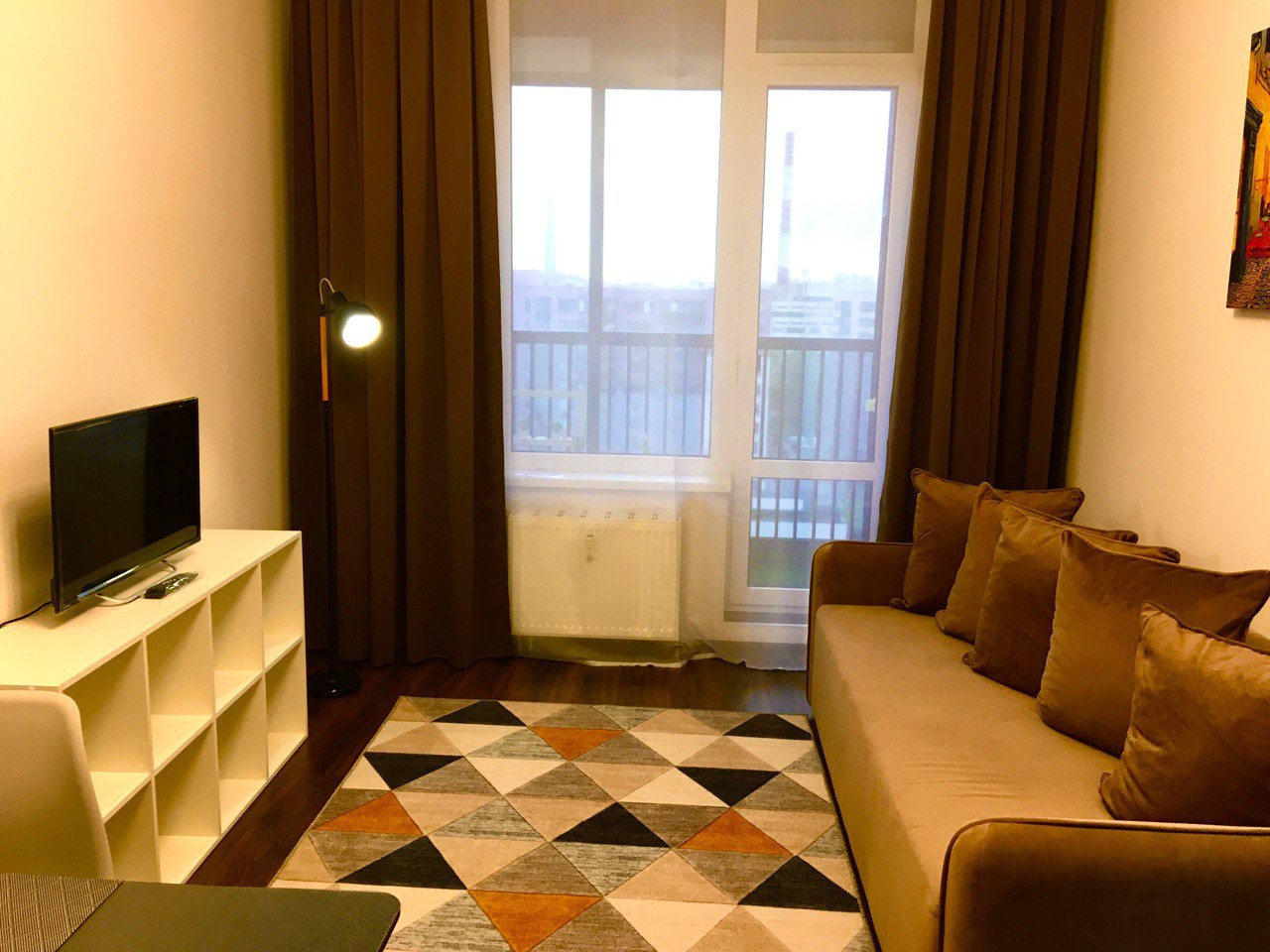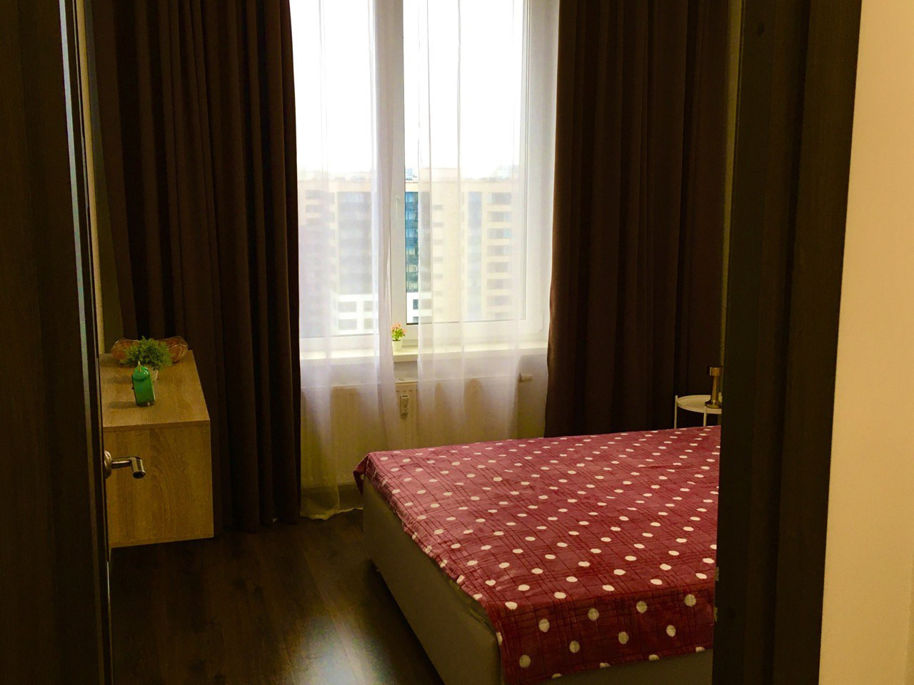 - Современная планировка – большая комната с кухонным сектором, отдельная спальня с высоким окном.