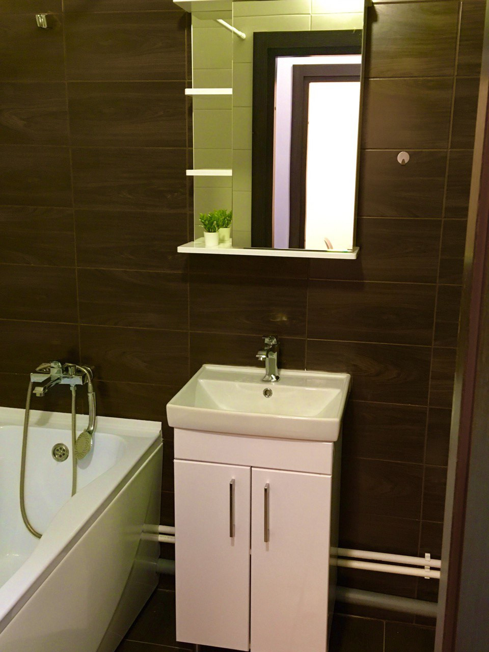 - Санузел оснащён ванной, умывальником, унитазом, тёплым полом, стиральной машиной, полочкой для хранения с зеркалом.