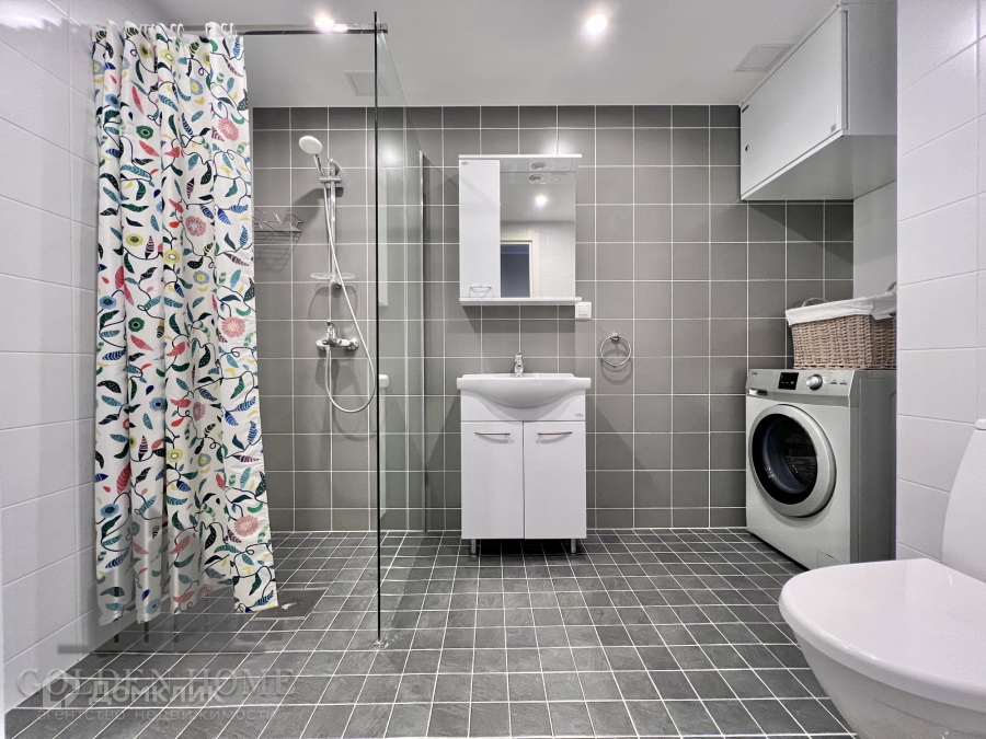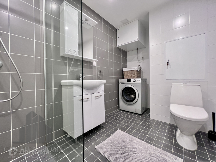Совмещенный: туалет, душ, ниша для хранения бытовой химии и банных принадлежностей, стиральная машина, теплый пол.