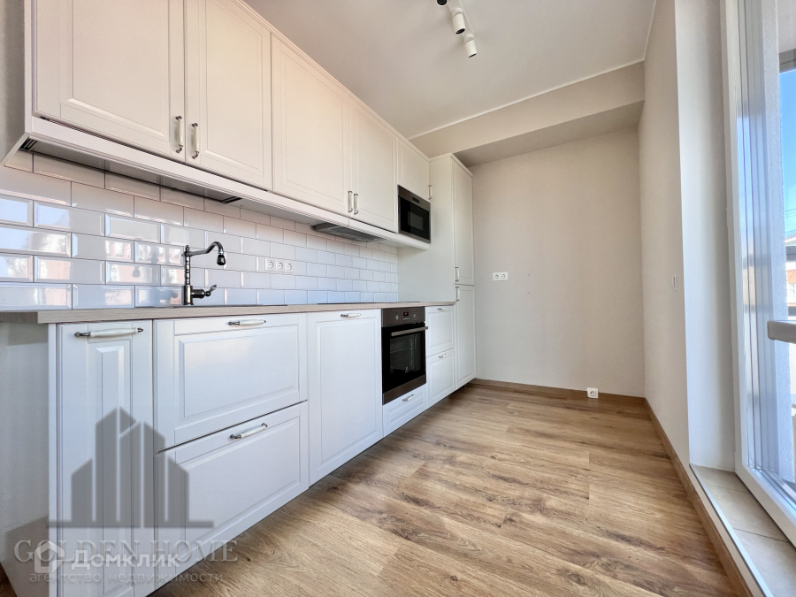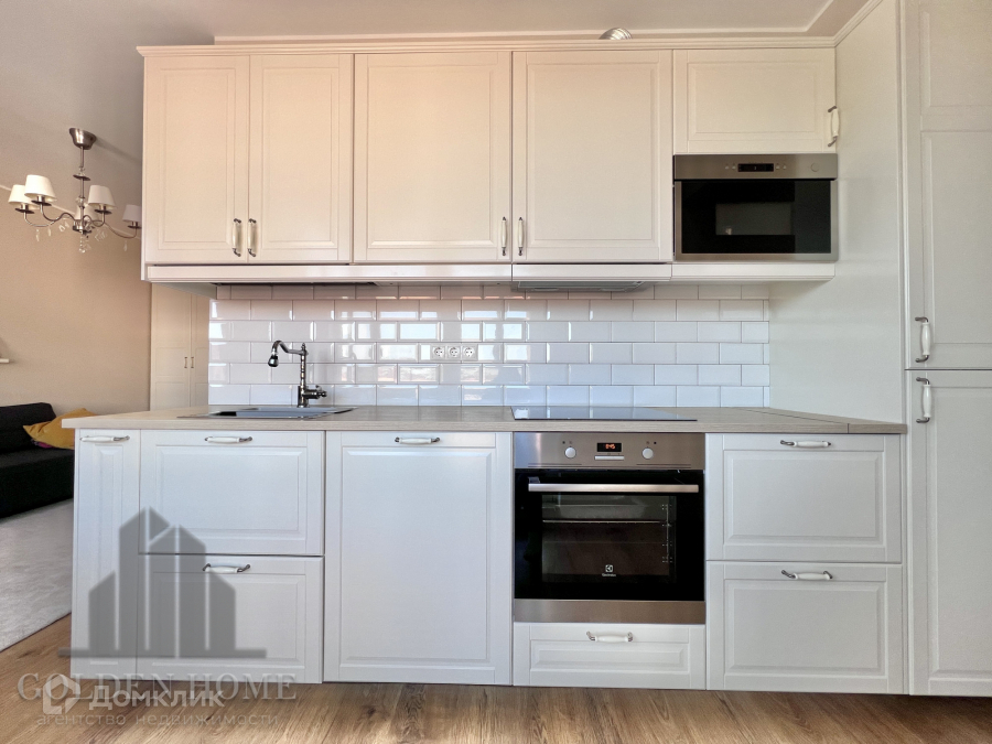 Встроенный гарнитур со всей необходимой техникой: духовка, варочная панель, вытяжка, микроволновка, холодильник, чайник, посудомоечная машина.