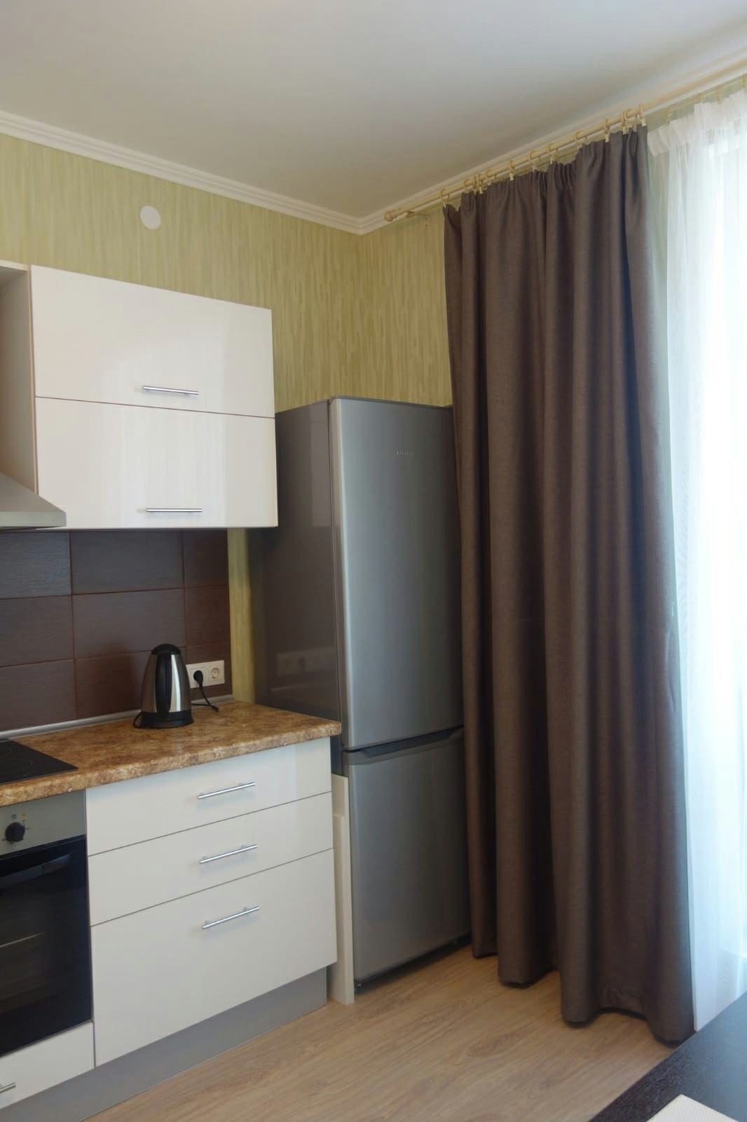 Керамическая варочная панель,встроенная духовка,микроволновка,стиральная машина,большой новый холодильник, ТВ , бойлер воды.Коммунальные платежи оплачиваются отдельно.