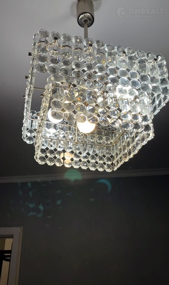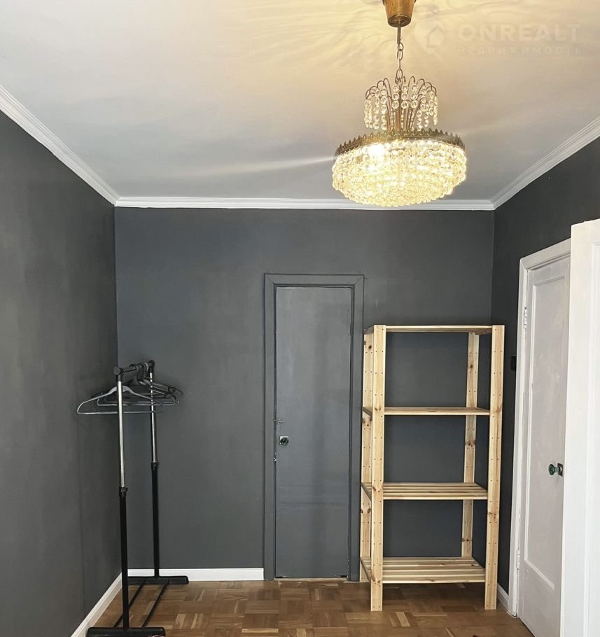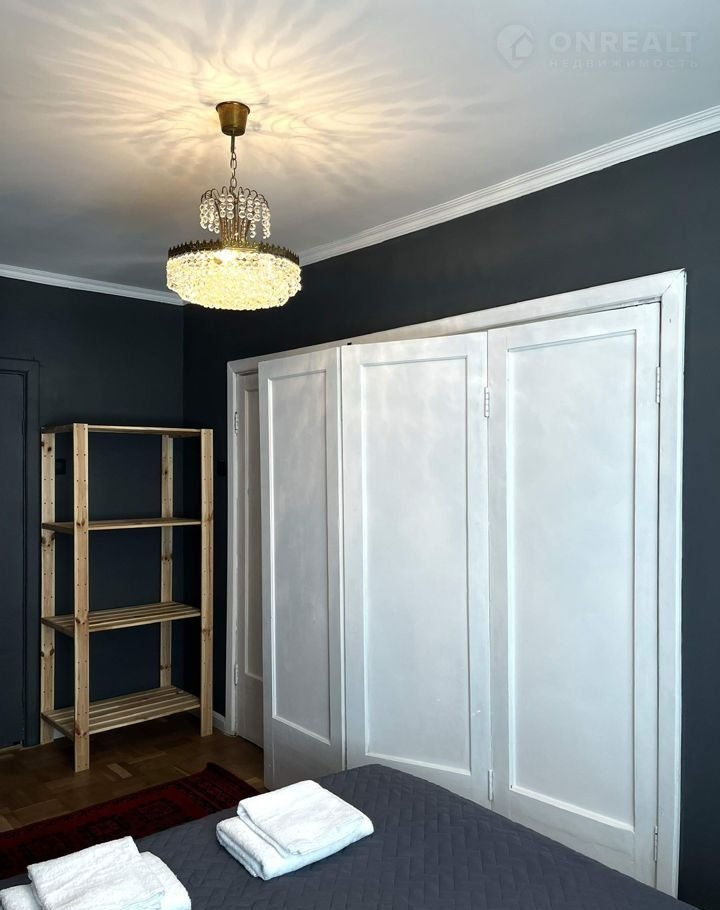 В спальне роскошная дубовая кровать с ортопедическим матрасом, винтажная хрустальная люстра 70-х годов прошлого века. Вешалка для одежды и стеллаж для вещей.