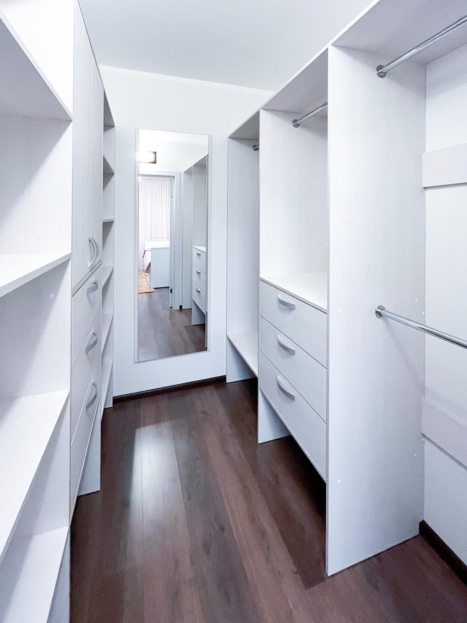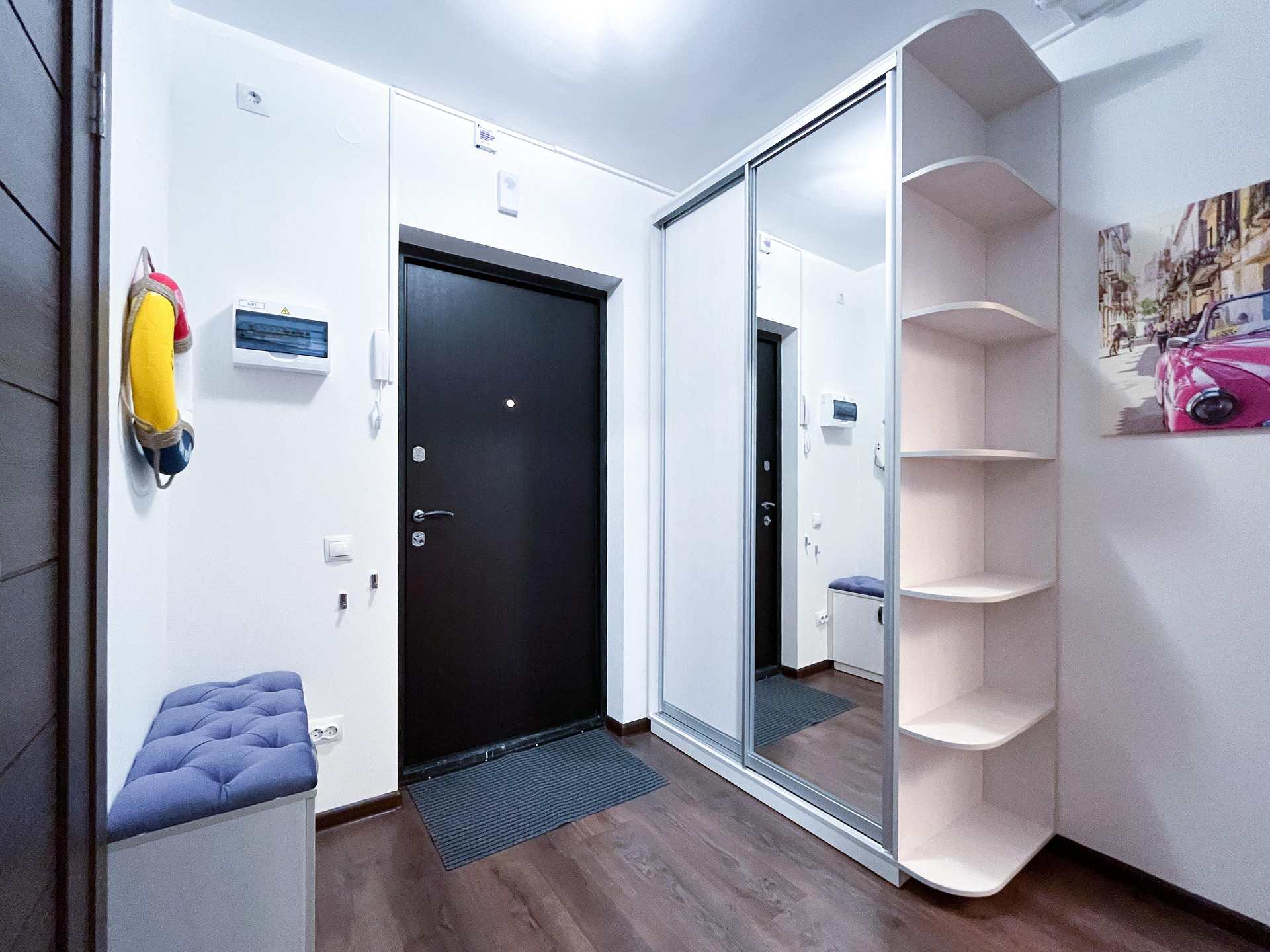 В прихожей установлен вместительный шкаф, в жилой комнате имеется гардеробная.
