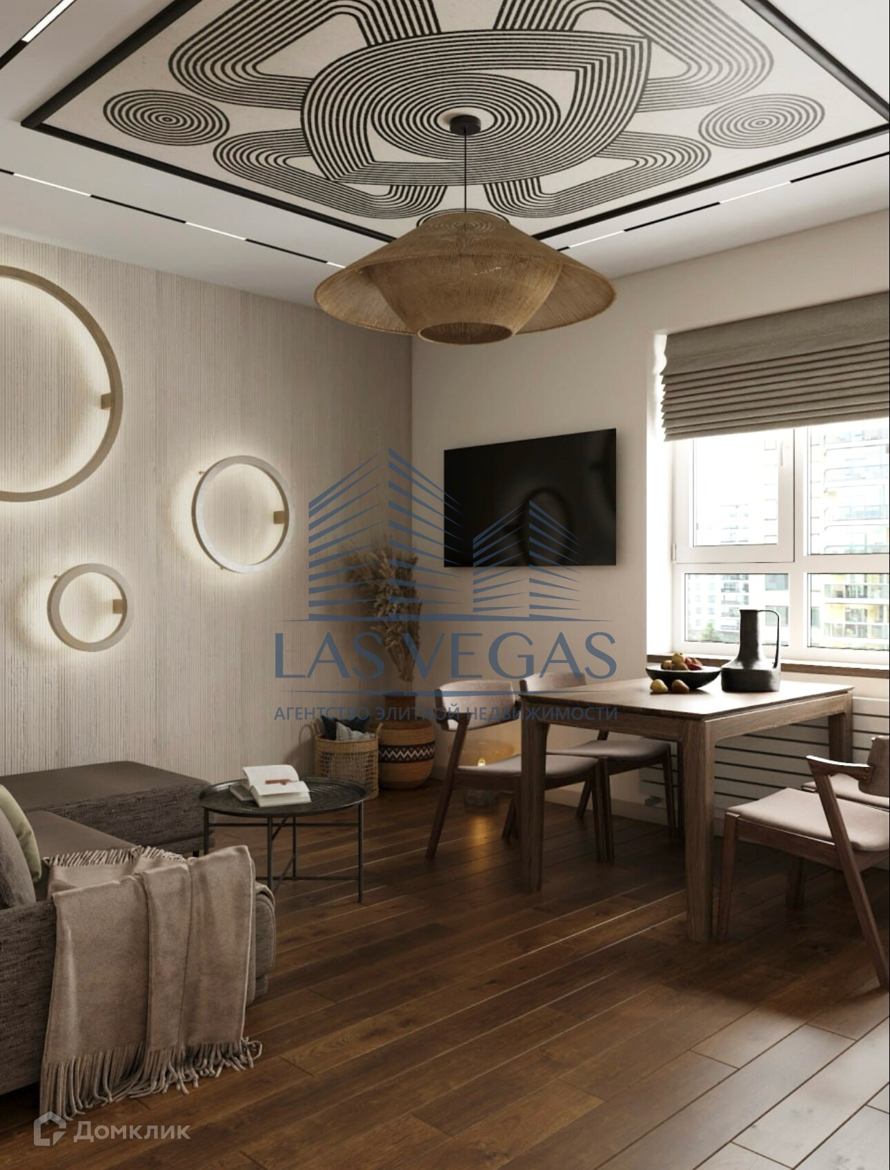 В зоне кухни-гостиной размещен телевизор. Ремонт выполнен из дорогих и высококлассных материалов.