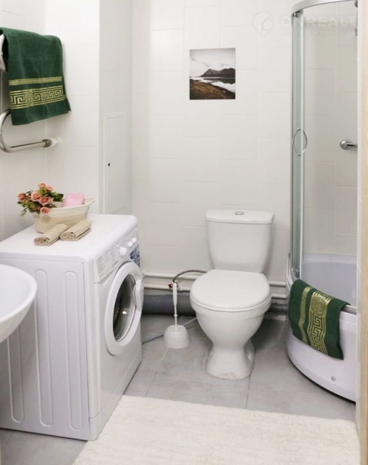 - в ванной душевая кабина, раковина, шкафчики и стиральная машина