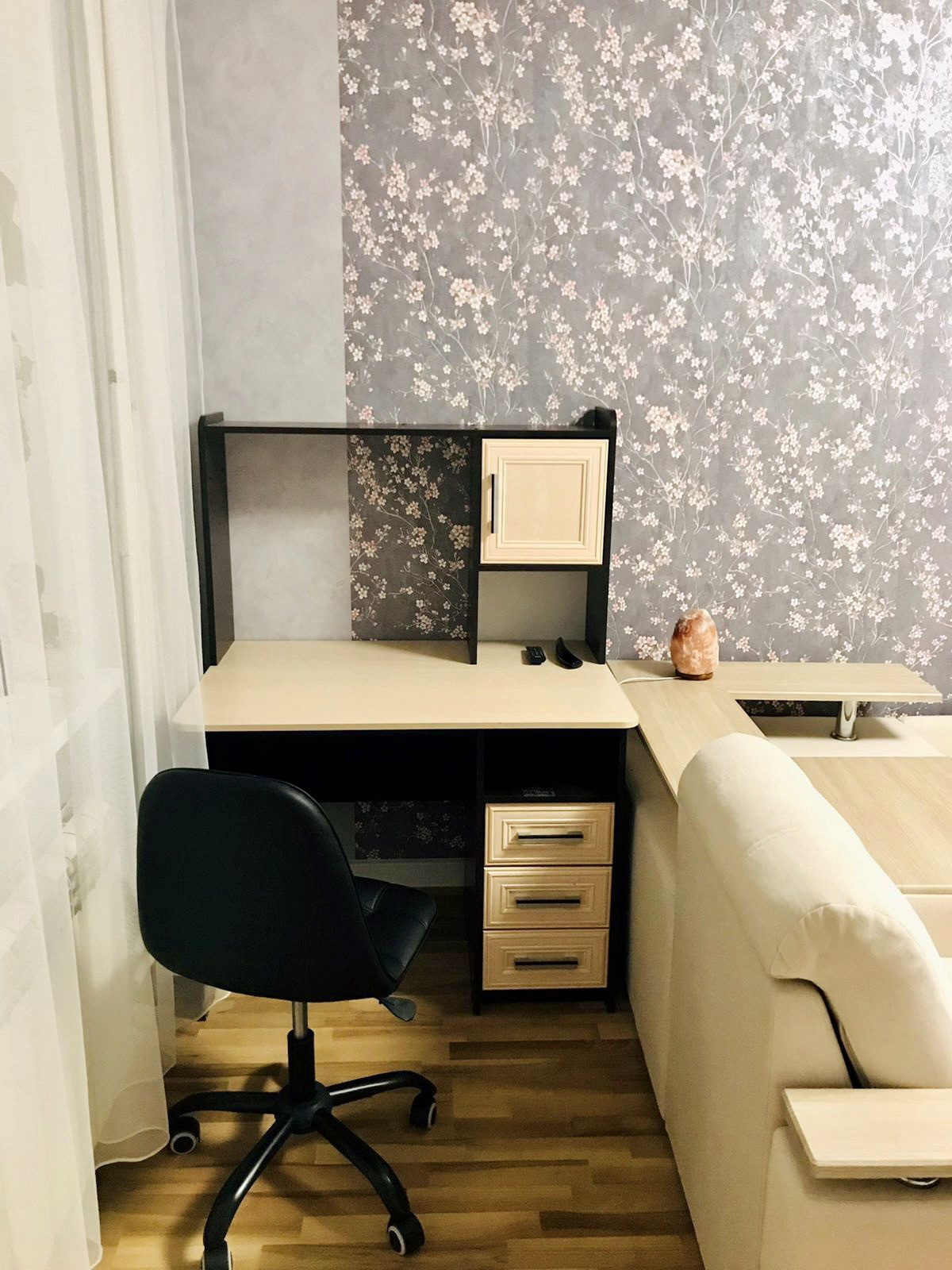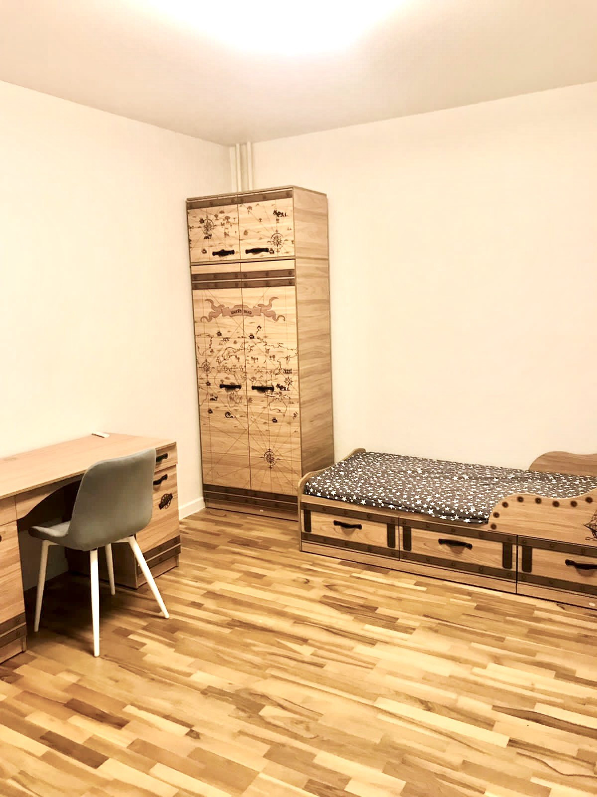 Мебель: диван ( угловой) раздвижной 1 шт. 2 сп., тв, 3 оборудованных рабочих места. 2 детские спальни. На кухне; стол обеденный 1шт. Стулья 3шт., кухонный встроенный гарнитур, с эл. Вар. Панелью с духовым шкафом, вытяжкой, холодильником, свч, чайником и стир. Маш.Автомат. Все современное в большинстве новое.