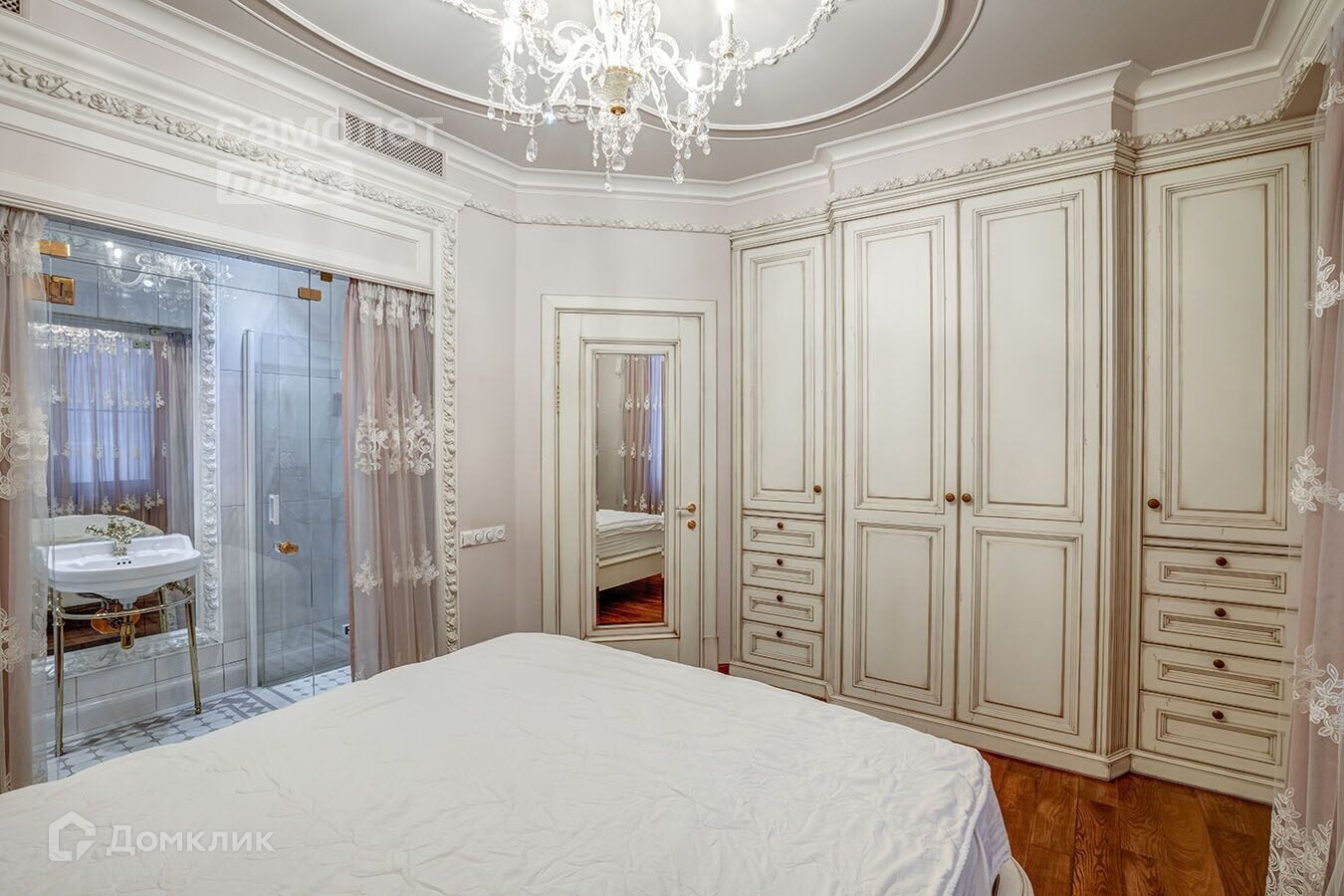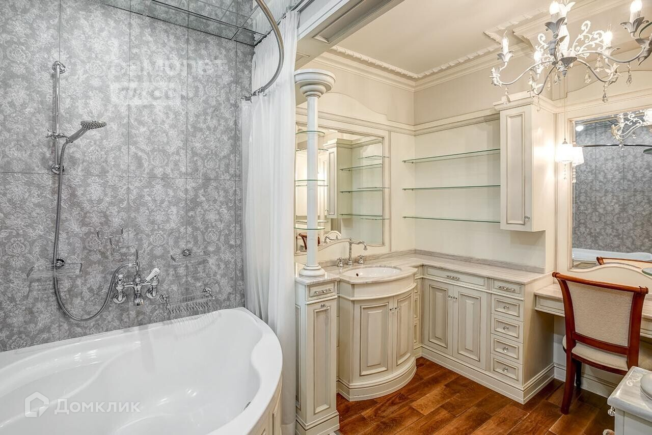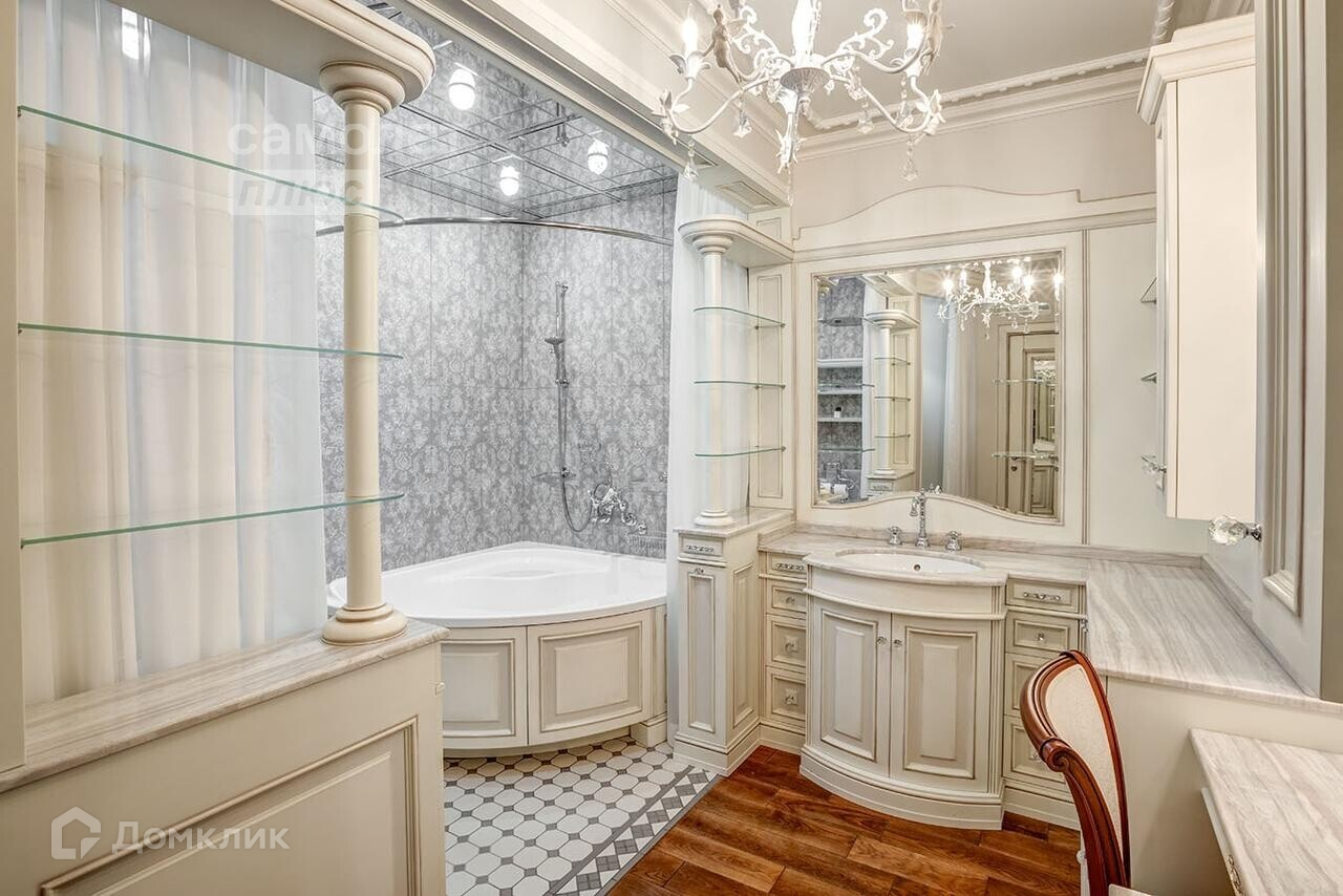 В квартире установлен подогрев полов. Окна выполнены из дуба. Сантехника Burlington & Boch. Люстры антиквариат и кристал Swarowski.