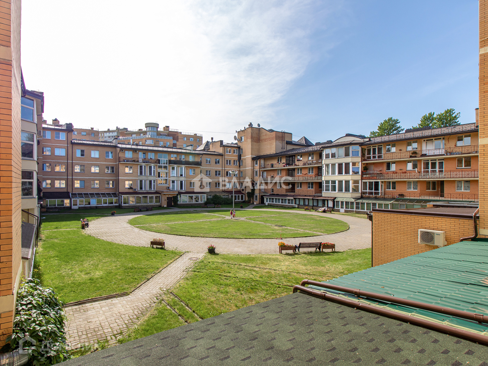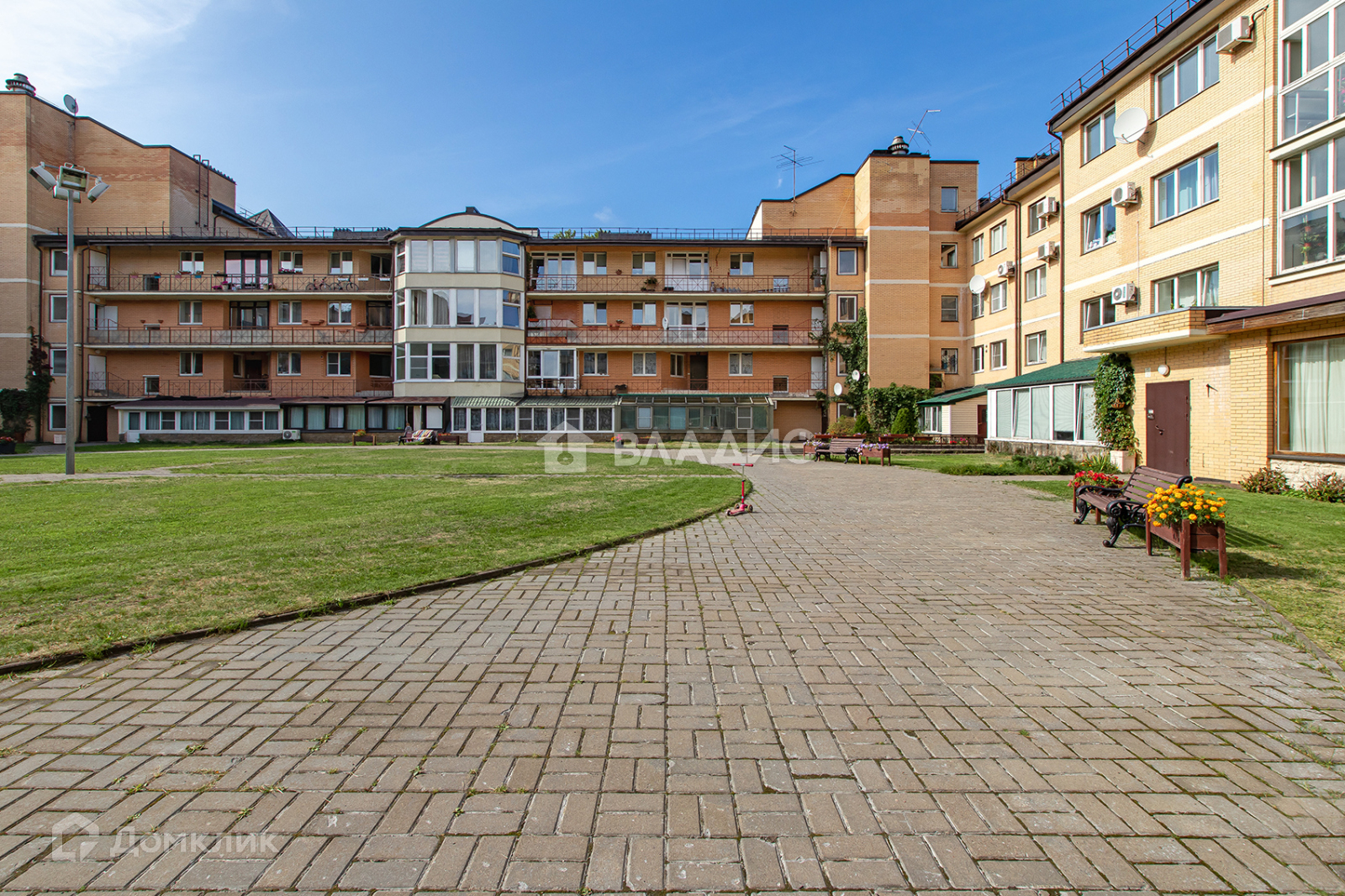 -Ухоженный двор с газоном, клумбами и диванами;