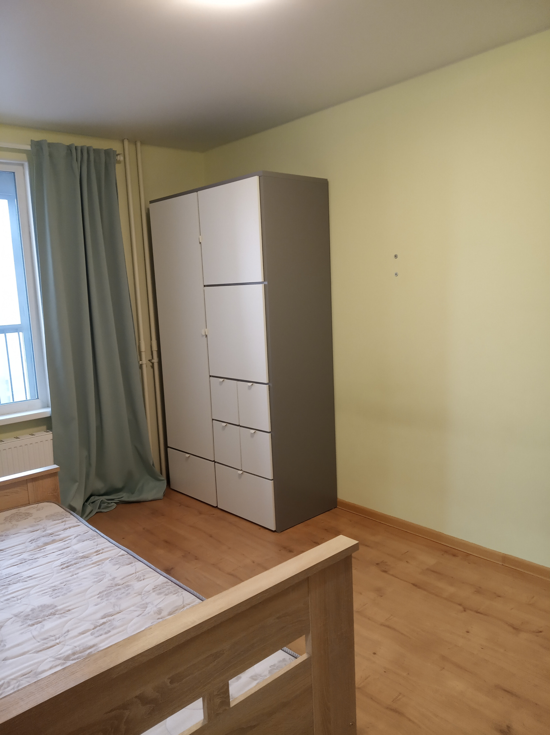 В спальне расположены кровать размером 1,4 х 2,0 м, 2 шкафа для одежды, книжный шкаф.