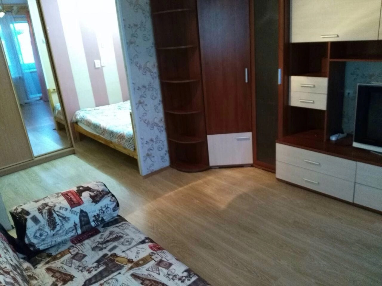спальня-гостиная с разделенными зонами с двуспальной кроватью и раскладным диваном-книжкой, зеркальным шкафом-купе, мебельной стенкой с полками и выдвижными ящиками для хранения, телевизором, кондиционером, пылесосом;