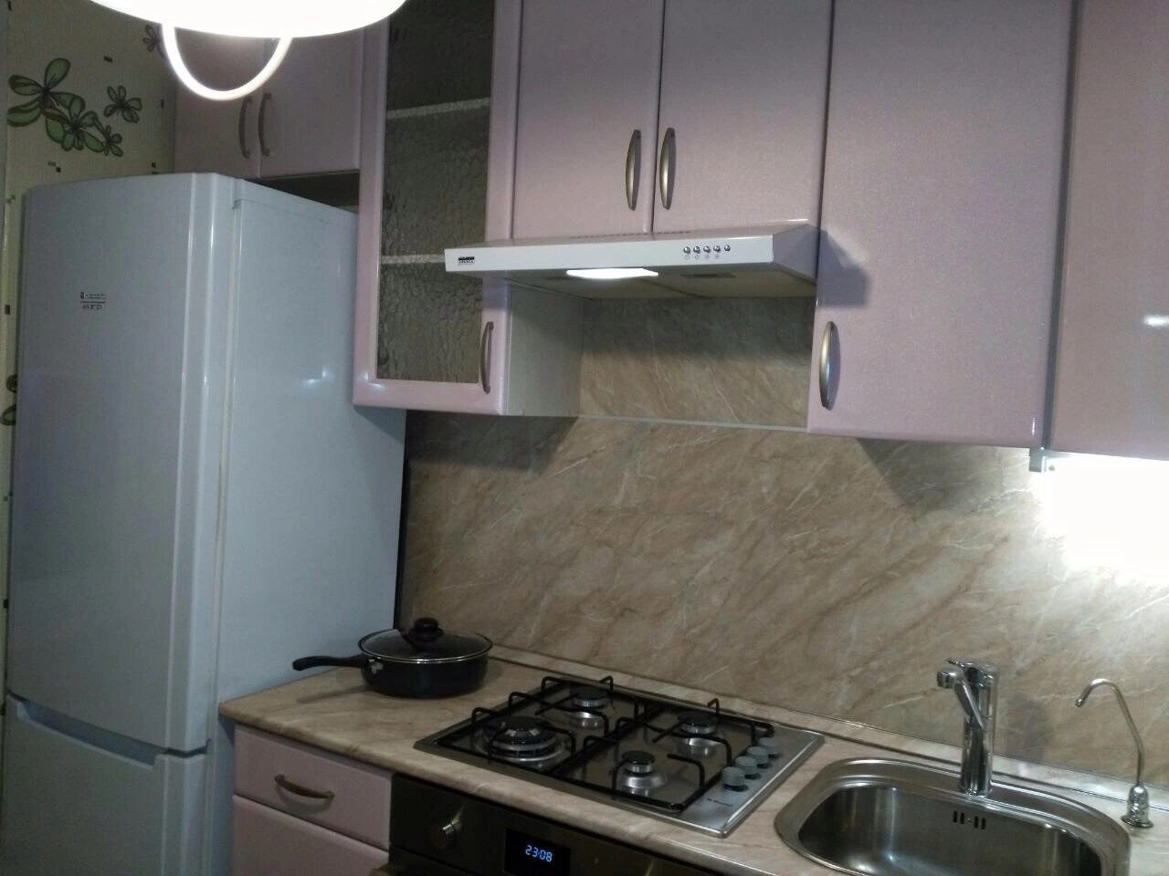 кухня со встроенной техникой (газовая варочная поверхность, духовой шкаф, вытяжка), холодильником, СВЧ ;