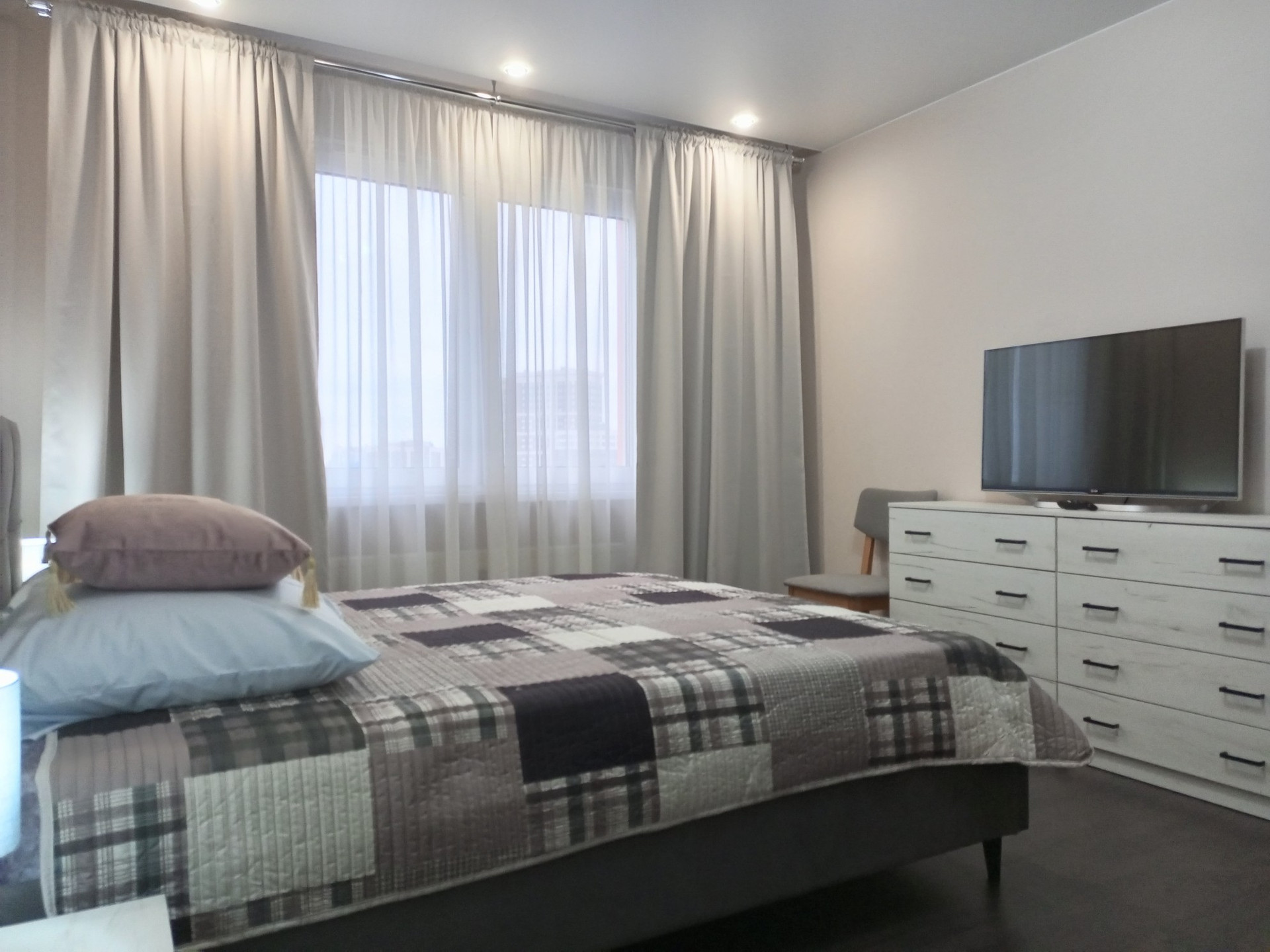 Комната с комфортабельной кроватью и матрасами двух видов жесткости. Комфортное рабочее место для удаленной работы.