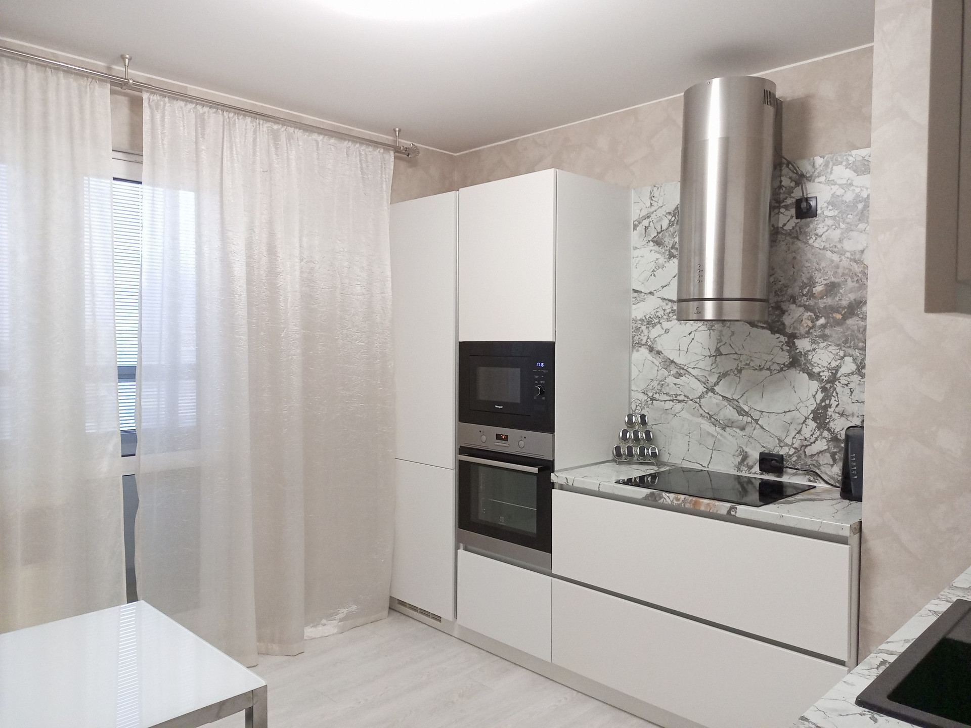 Просторная и стильная кухня с хорошей встроенной техникой укомплектована полностью, включая посуду и дополнительную фильтрацию воды.
